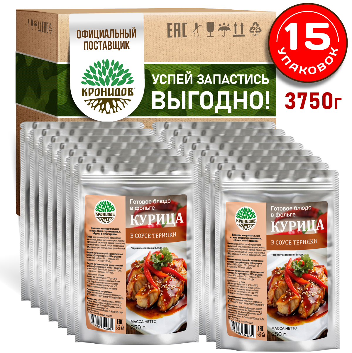 Готовое блюдо в реторт-пакете "Курица в соусе терияки " Кронидов. Сухой паек для охоты, рыбалки, в поход. Набор 15 шт. 250 г