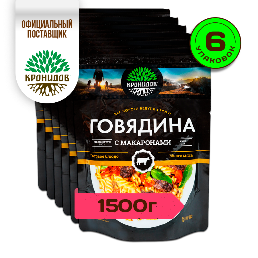 Готовое блюдо в реторт-пакете "Говядина с макаронами" Кронидов Сухой паек для охоты, рыбалки, в поход Набор 6 шт. по 250 гр