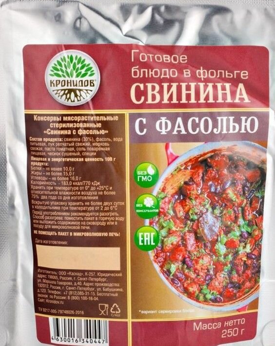 Ниже Вы можете прочитать отзывы на Свинина с фасолью Готовое блюдо в реторт-пакете ТМ Кронидов. Консерва 250 г, ознакомится с подробными характеристиками, посмотреть интересные обзоры и фотографии на Свинина с фасолью Готовое блюдо в реторт-пакете ТМ Кронидов. Консерва 250 г.