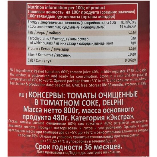 | Состав | очищенные томаты, томатный сок, регулятор кислотности: лимонная кислота |