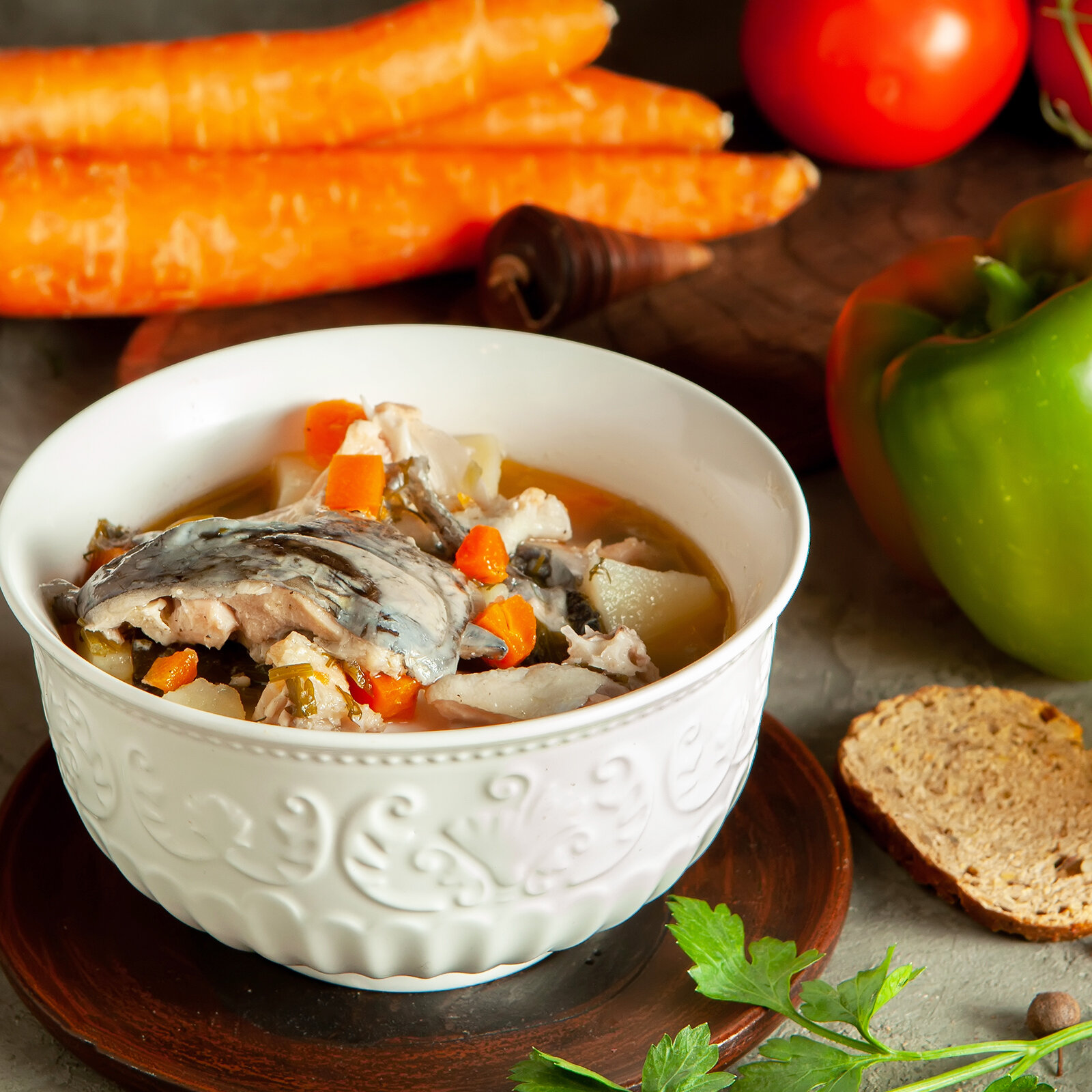 | Состав | семга, голова семги, картофель, морковь, укроп, зеленый перец, петрушка, лук репчатый, черный перец, лавровый лист, растительное масло, соль, вода |