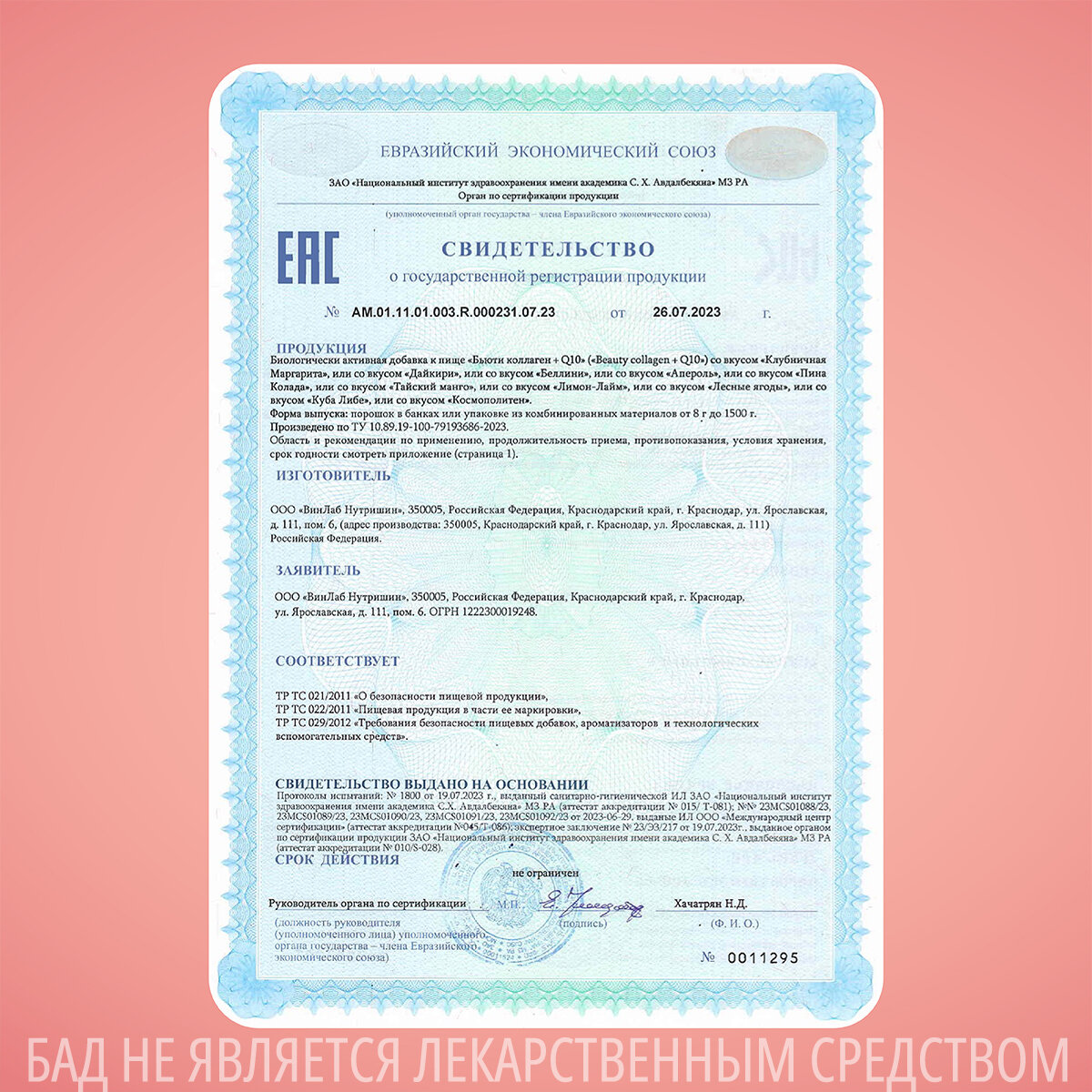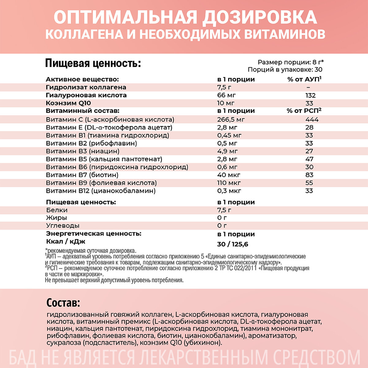 | Дополнительная информация | Состав: гидролизованный говяжий коллаген, L-аскорбиновая кислота, ароматизаторы, гиалуроновая кислота, витаминный премикс (L-аскорбиновая кислота, DL-α-токоферола ацетат, ниацин, кальция пантотенат, пиридоксина гидрохлорид, тиамина гидрохлорид, рибофлавин, фолиевая кислота, биотин, цианокобаламин), сукралоза (подсластитель), коэнзим Q10 (убихинон). |