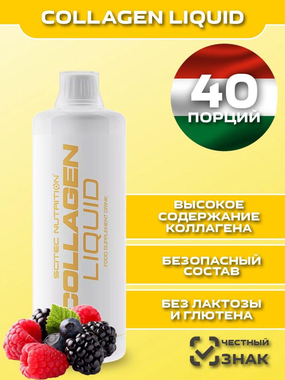 | Дополнительная информация | обогащен витамином В6, 40 порций в бутылке, не содержит аллергенов согласно правила ЕС № 1169/2011; рекомендации по применению: развести одну порцию коллагена (25 мл) в 250 мл воды; принимать 1 раз в день на пустой желудок; хорошо взболтать перед использованием; состав: вода, гидролизованный коллаген, фруктоза, регулятор кислотности (лимонная кислота), глицин, Е202 (сорбат калия), ароматизатор, пиридоксин гидрохлорид, Е 950 (ацесульфам K), Е952 (цикламат натрия), Е954 (сахарин натрия), эмульгатор (моно и диглицериды жирных кислот); энергетическая ценность на 100 г: содержание жиров в 100 г: 0 г; содержание белков в 100 г: 44 г; содержание углеводов в 100 г: 10 г; калорийность 100 г: 240 ккал; содержание жиров в 100 г: 0 г; содержание белков в 100 г: 44 г; содержание углеводов в 100 г: 10 г; калорийность 100 г: 240 ккал |