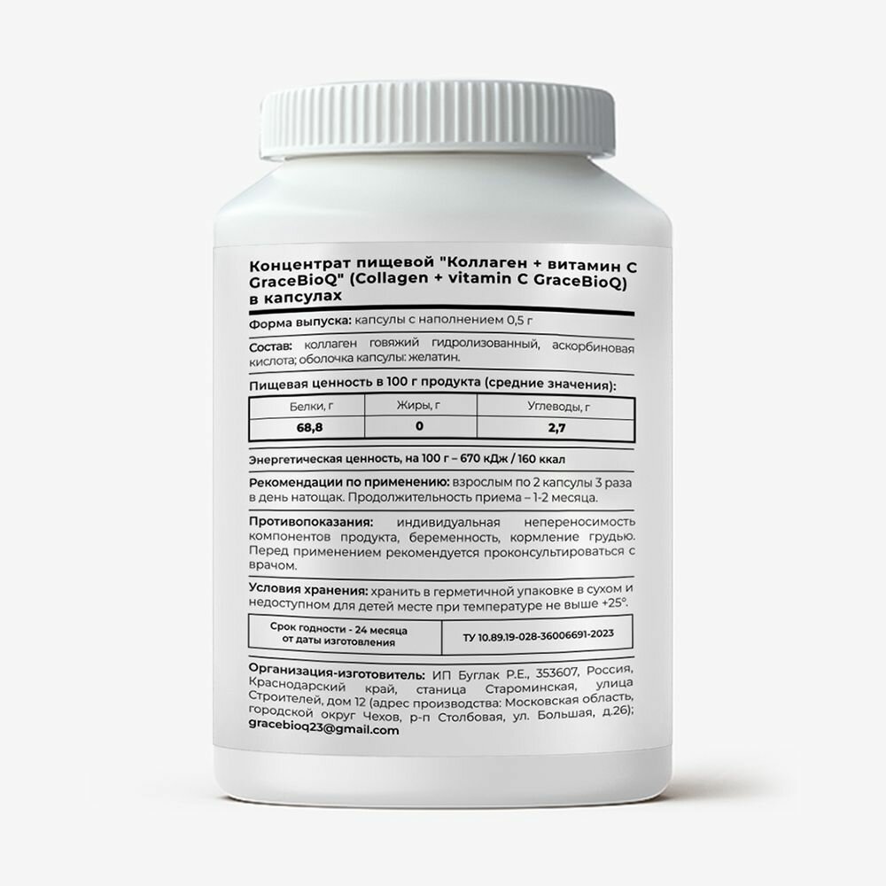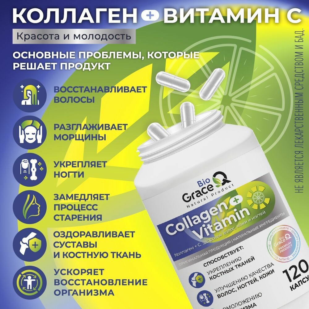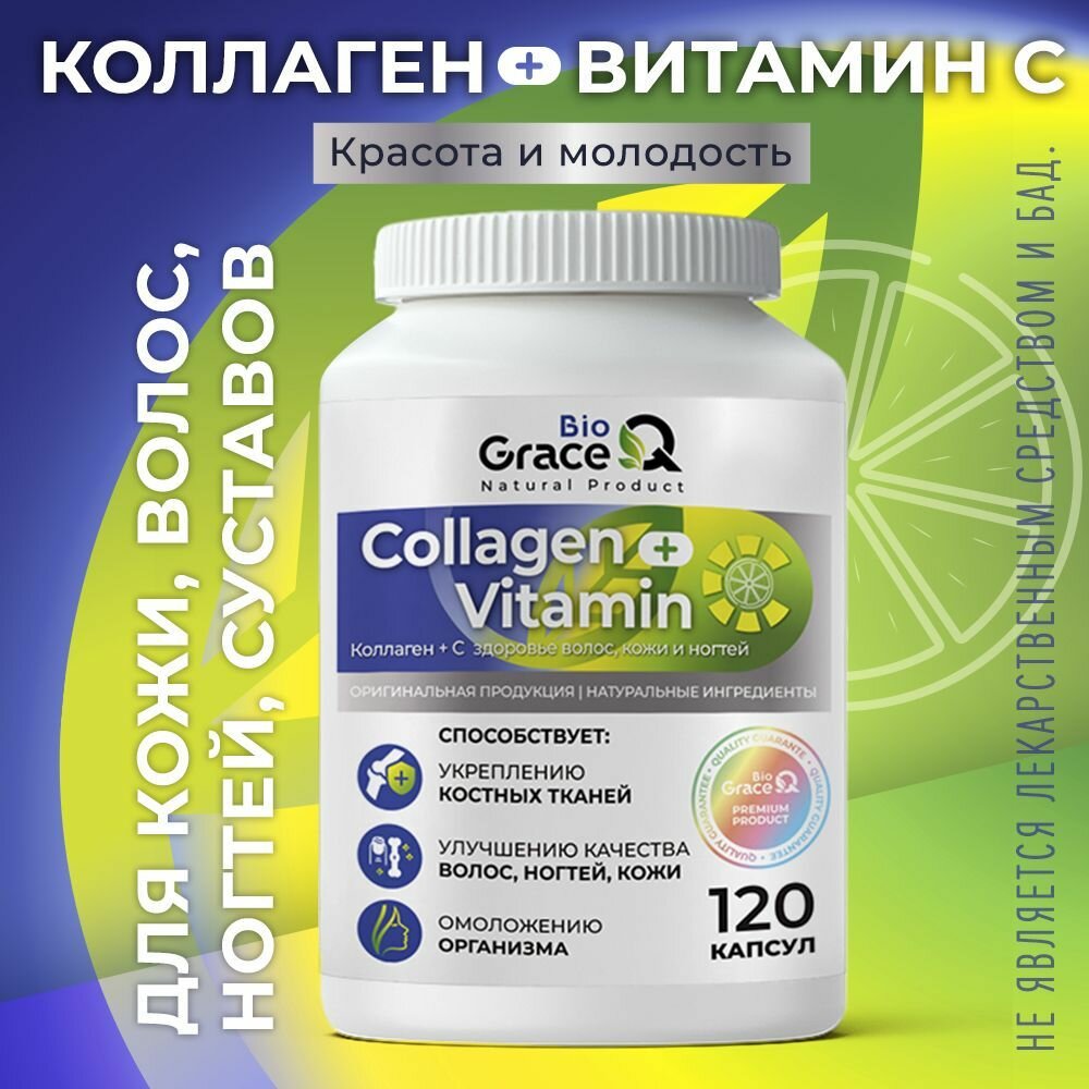 Купить Коллаген GraceBioQ с витамином С для суставов, связок, ногтей, волос и кожи, 120 капсул