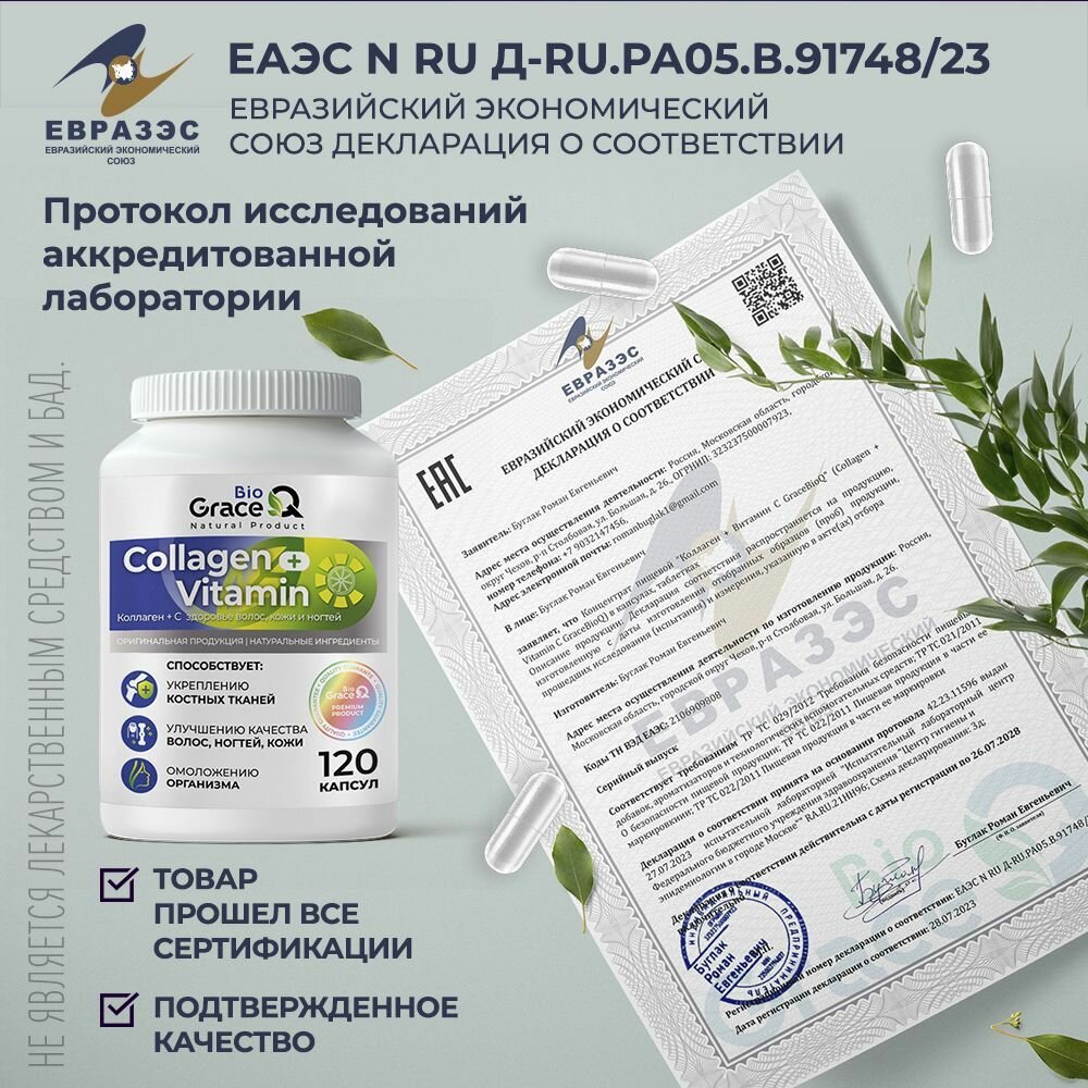 Коллаген GraceBioQ с витамином С для суставов, связок, ногтей, волос и кожи, 120 капсул интересное: