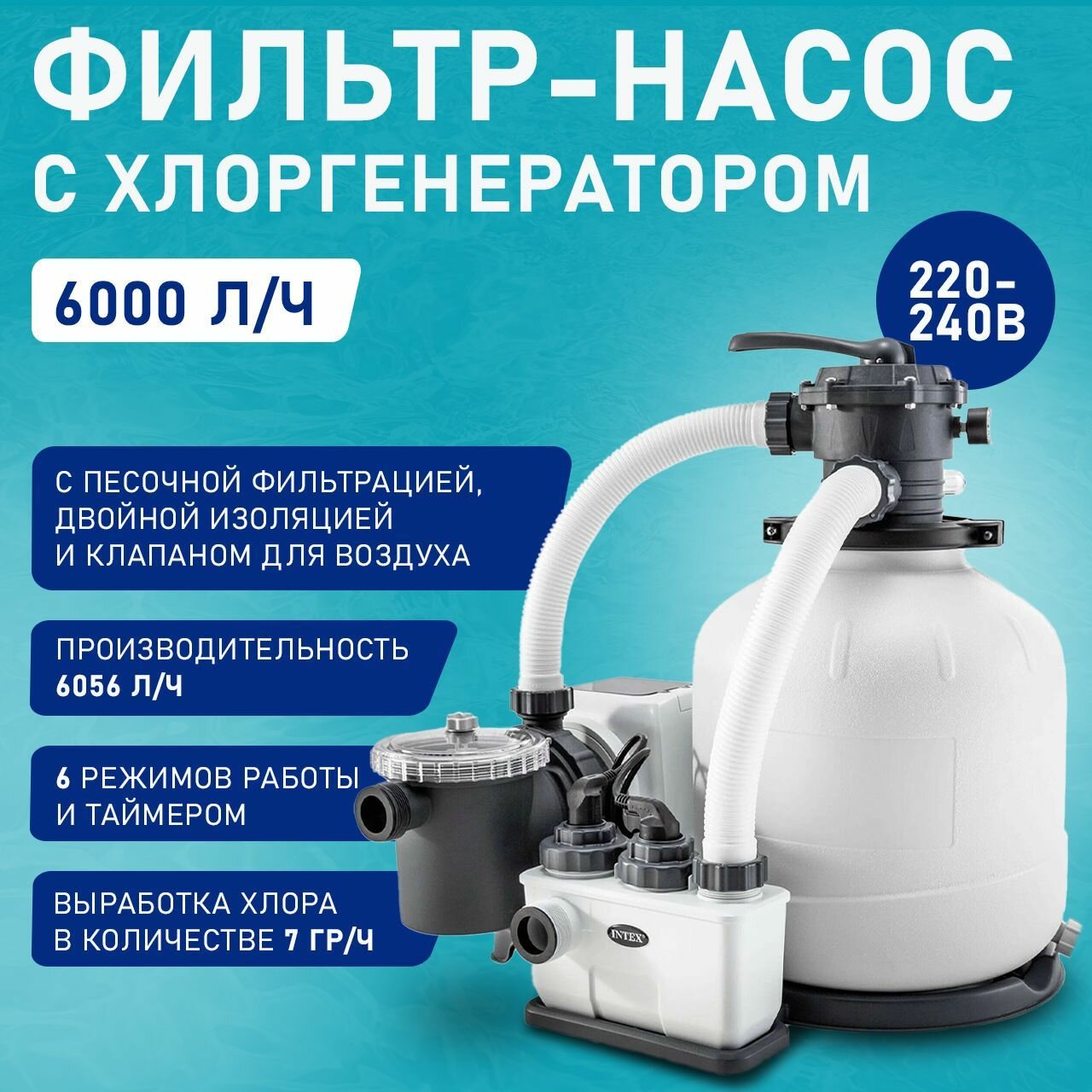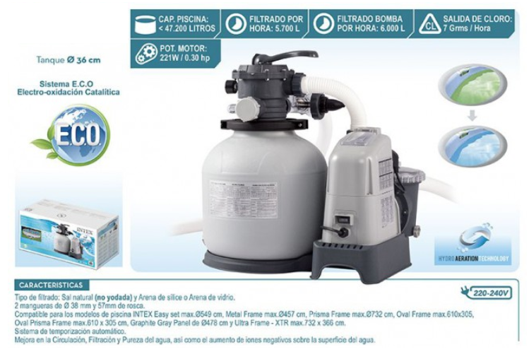 26676 Хлоргенератор с песочным фильтр-насосом 6000л/ч, для бассейна до 32м3 Intex система морской воды