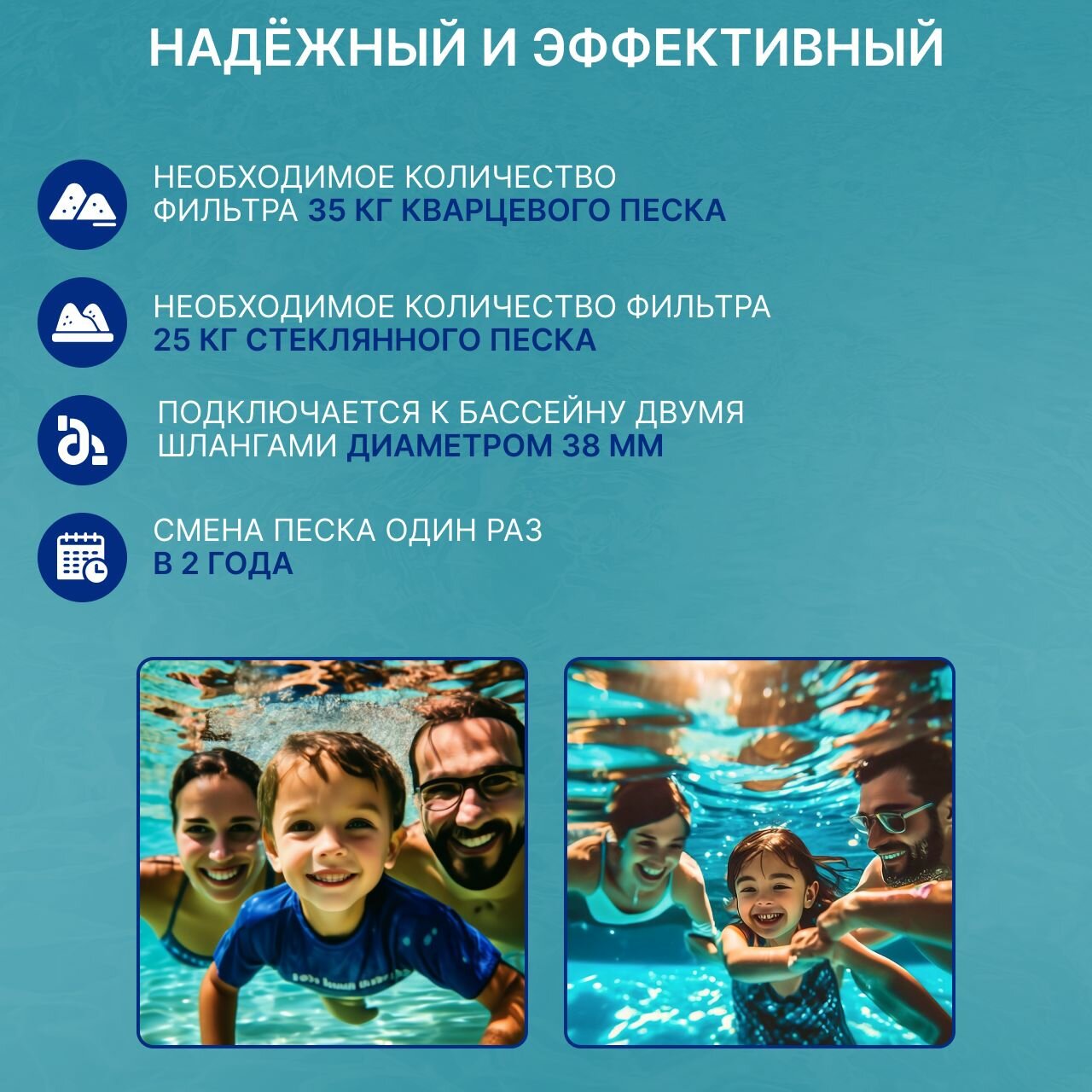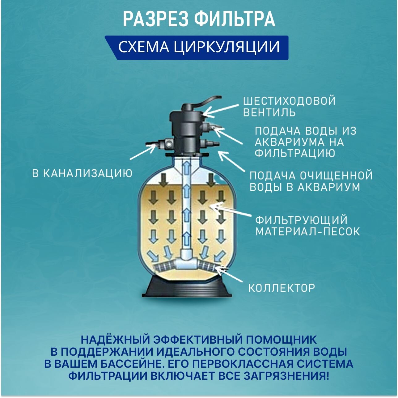 | Дополнительная информация | Для фильтра подходят два типа песка кварцевый (23 кг.), стеклянный (16 кг.) с фракцией 0,4-0,8 мм. |