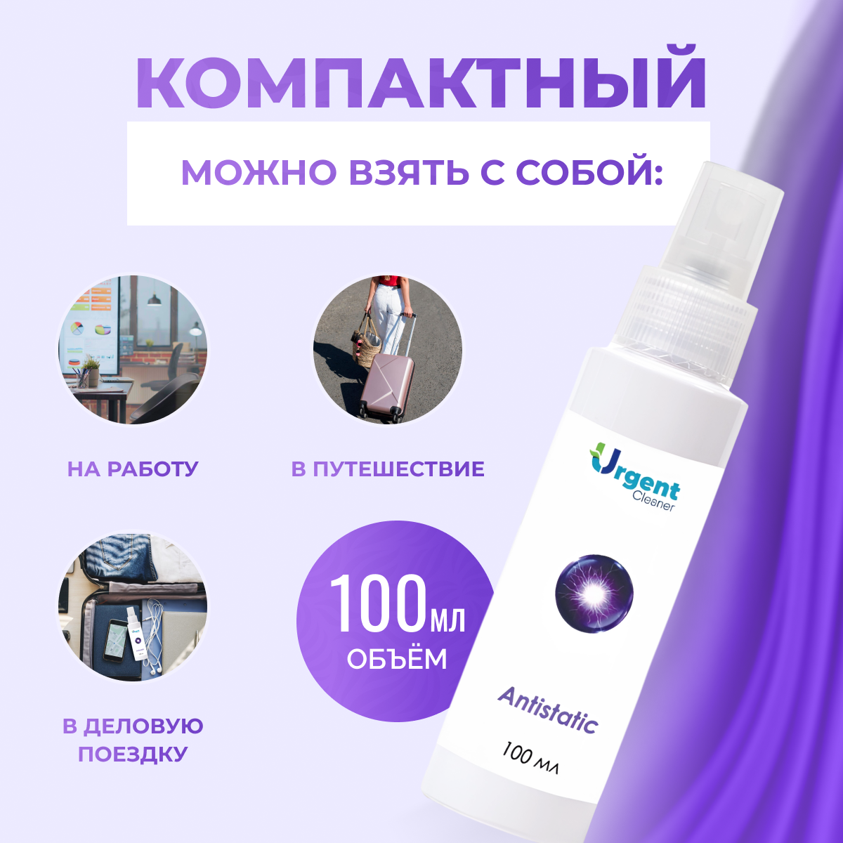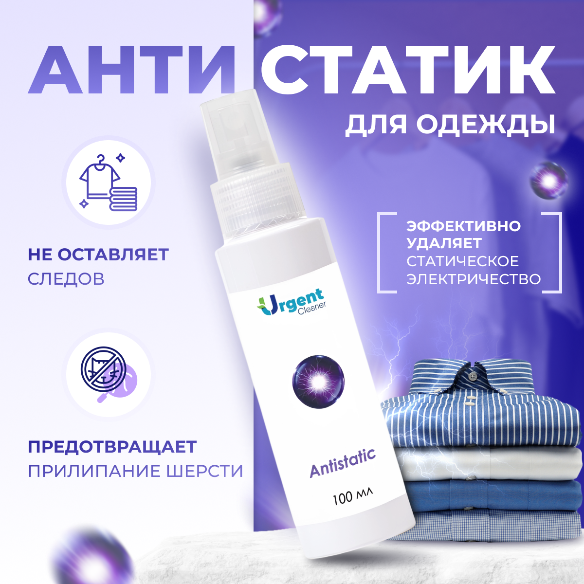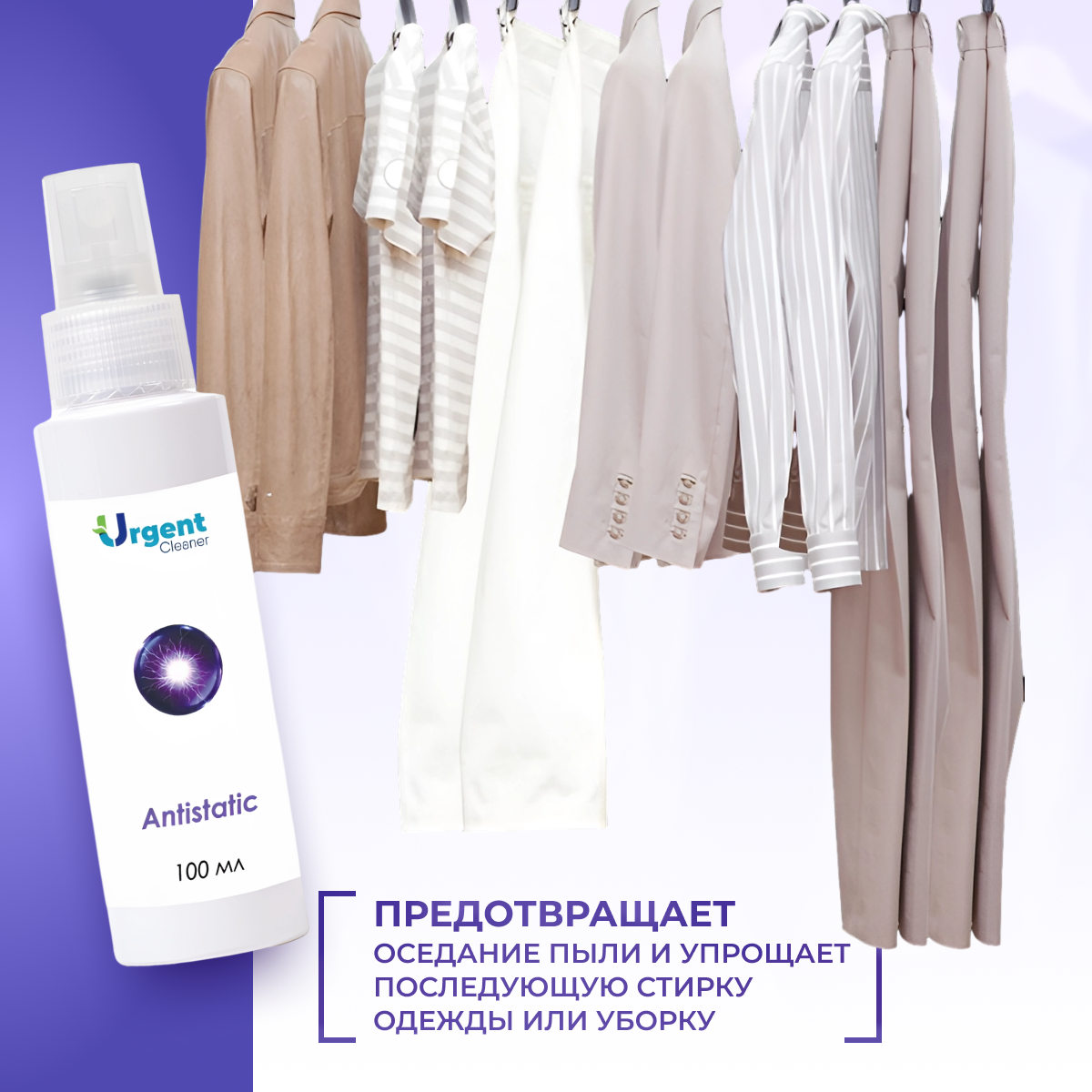 Антистатик Urgent, спрей для одежды, белья и мебели, фиолетовый, 100мл