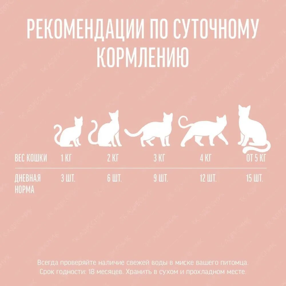 | Дозировка | см. таблицу. Корм готов к употреблению. Проследите, чтобы у вашей кошки всегда была свежая вода. |
