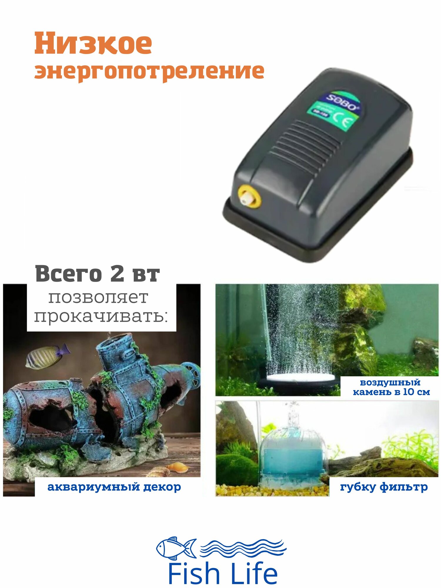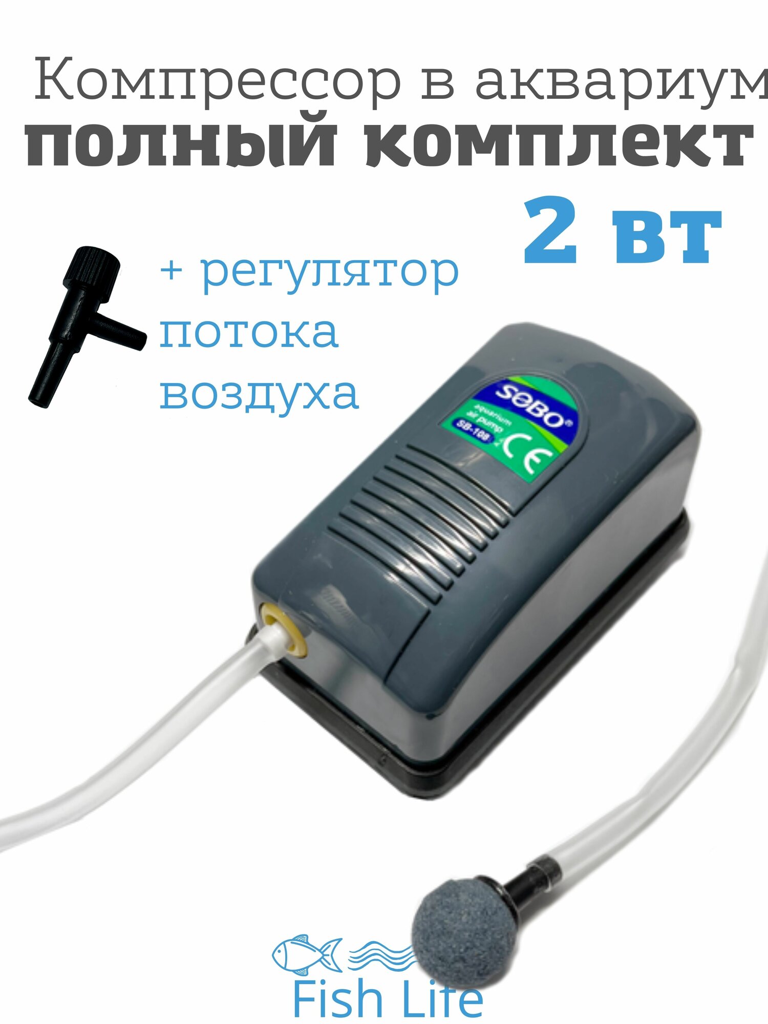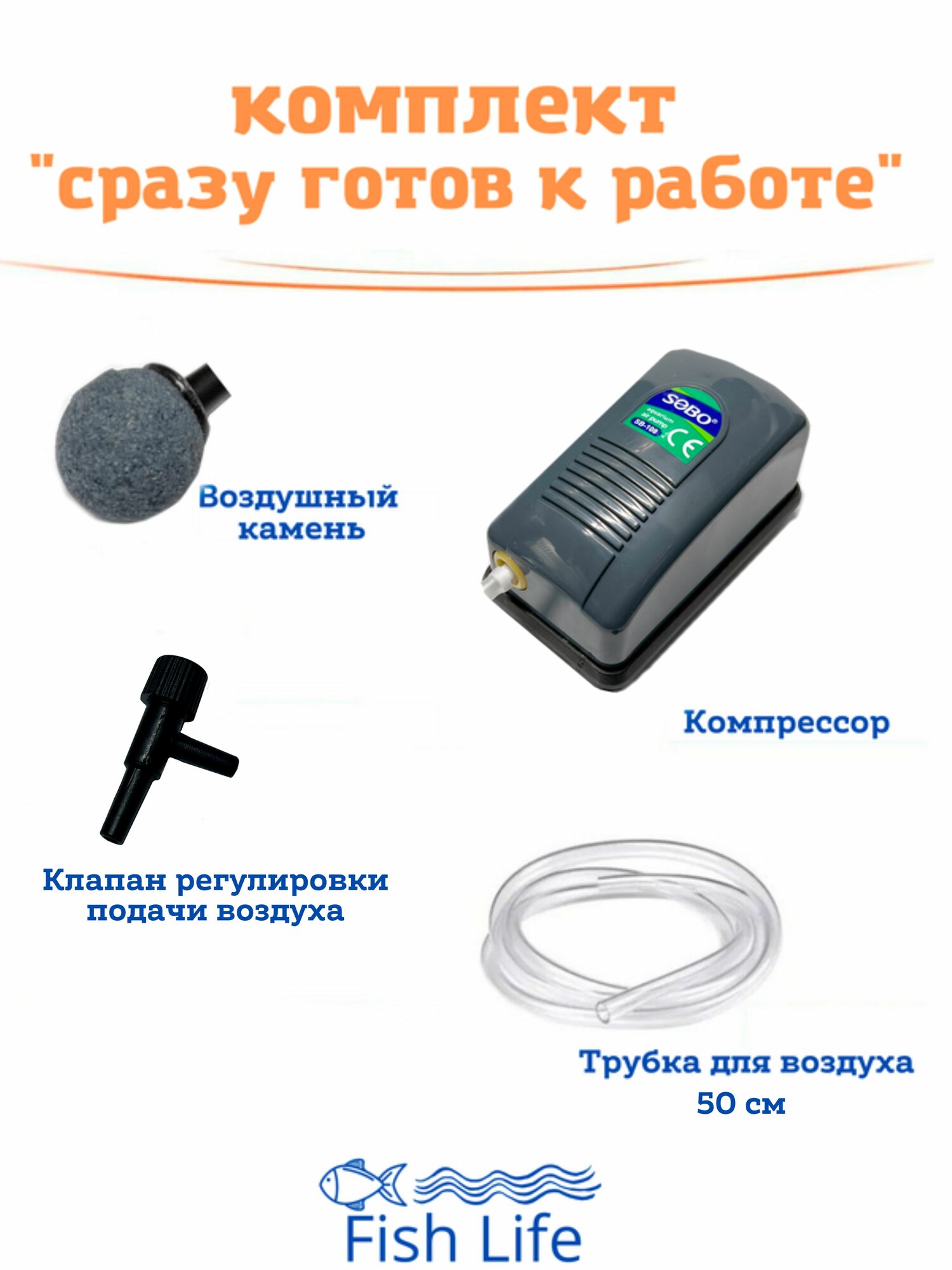 | Подробная комплектация | КОМПРЕССОР, ТРУБКА 50 см., регулировочный клапан(регулировка потока воздуха), воздушный камень. |