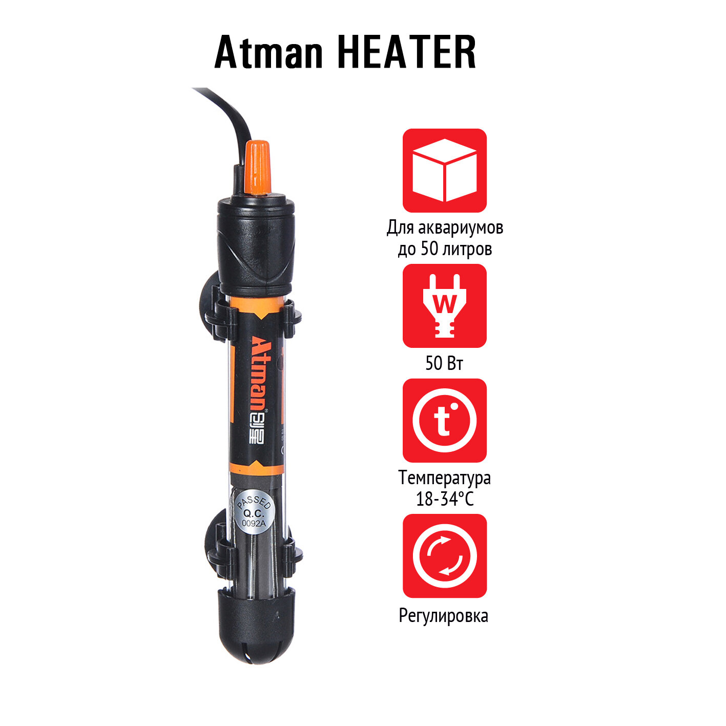 Нагреватель для аквариума Atman Heater объемом до 50 литров, 50 W t 18-34C