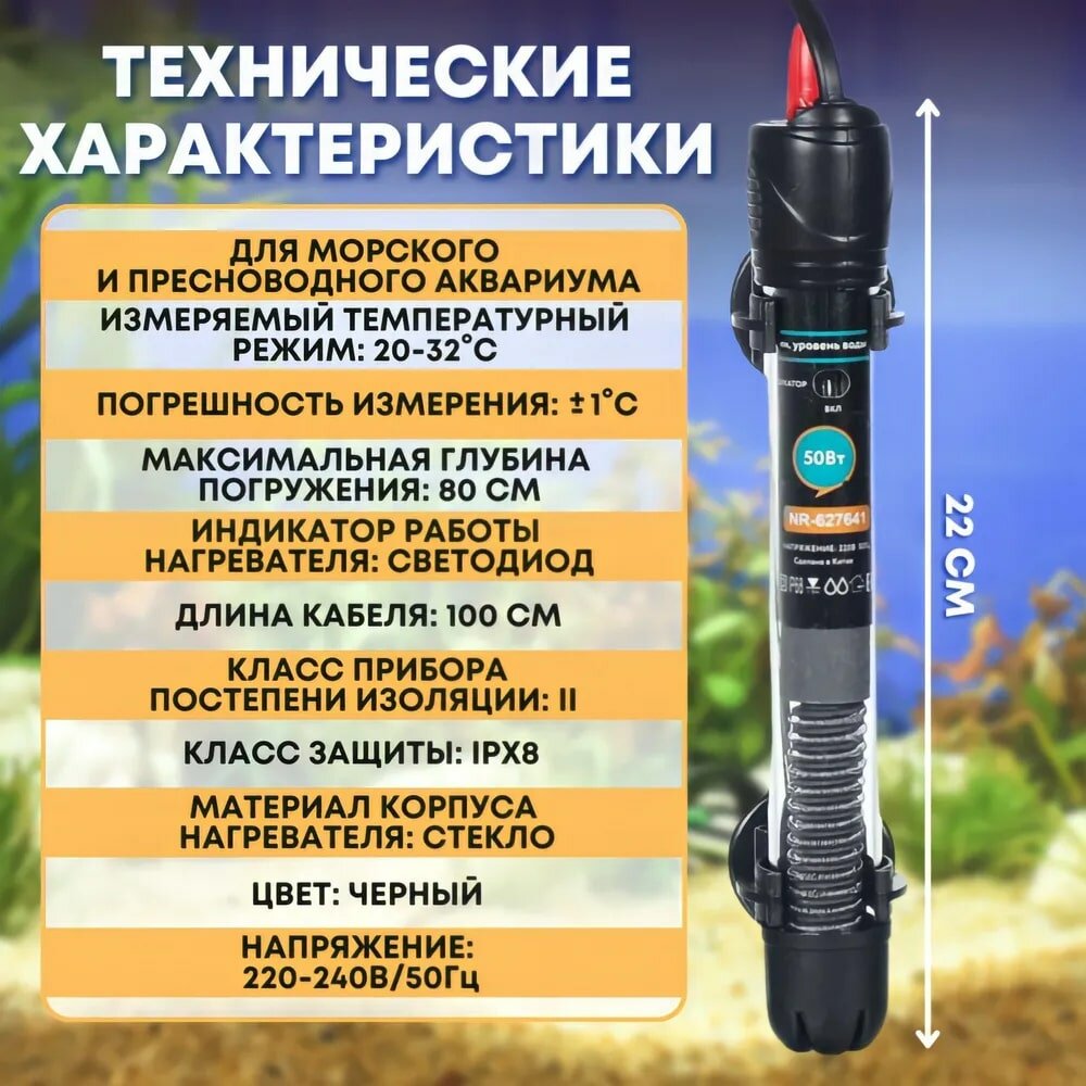 | Особенности | на присосках / обогрев / подходит для морской воды / регулировка температуры / светодиодный индикатор |