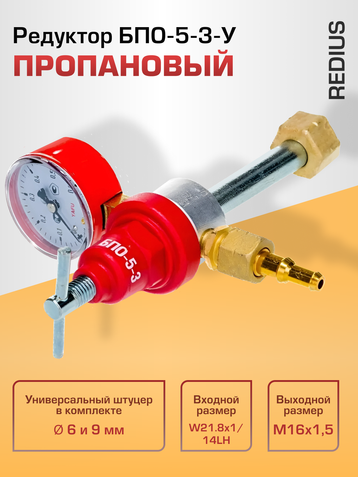 | Подробная комплектация | Редуктор пропановый сварочный РЕДИУС БПО-5-3-У (01206) |