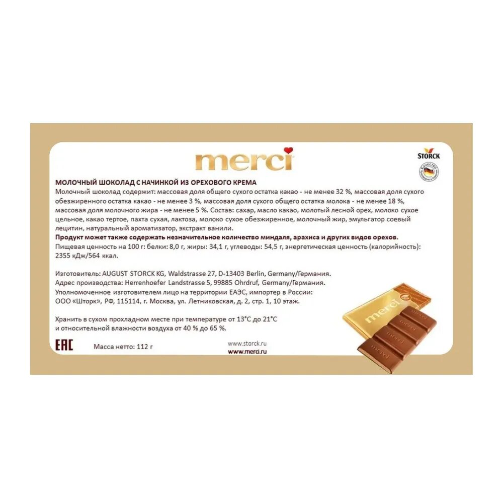Merci, шоколад молочный с ореховым кремом, шоколадные плитки 112г. Мерси, произведено в Германии