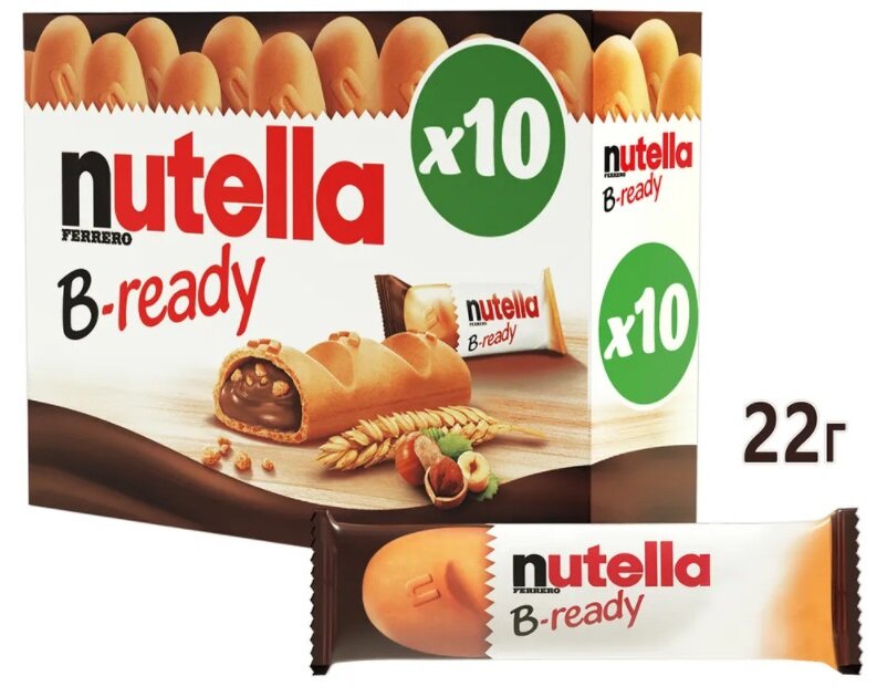 Вафельный батончик B-Ready, с начинкой из пасты Nutella с добавлением какао, 20 шт по 22 г интересное: