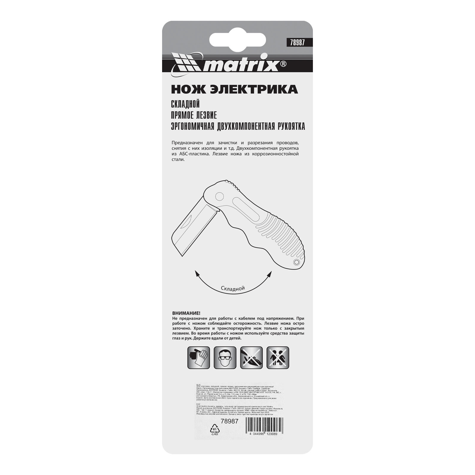 Нож электрика, складной, прямое лезвие, эргономичная двухкомпонентная рукоятка// Matrix 78987 .