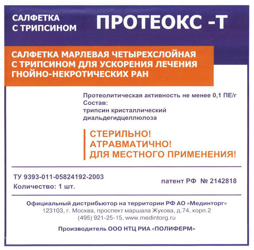 Протеокс-Т - салфетка для очищения и ускорения заживления гнойных ран, пролежней, 10х10 см