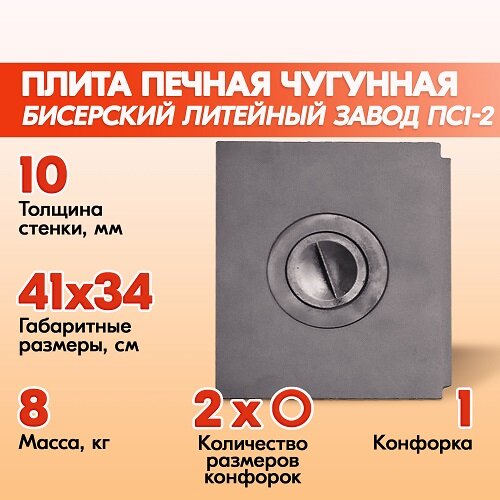 Плита печная чугунная составная Бисерский Литейный Завод ПС1-2 410х340 мм, плита для печи одноконфорочная