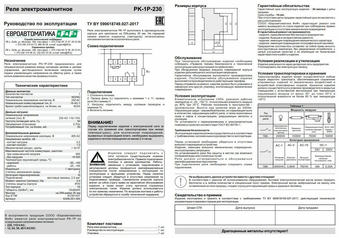 Промежуточное реле Евроавтоматика F&F PK-1P 230в интересное: