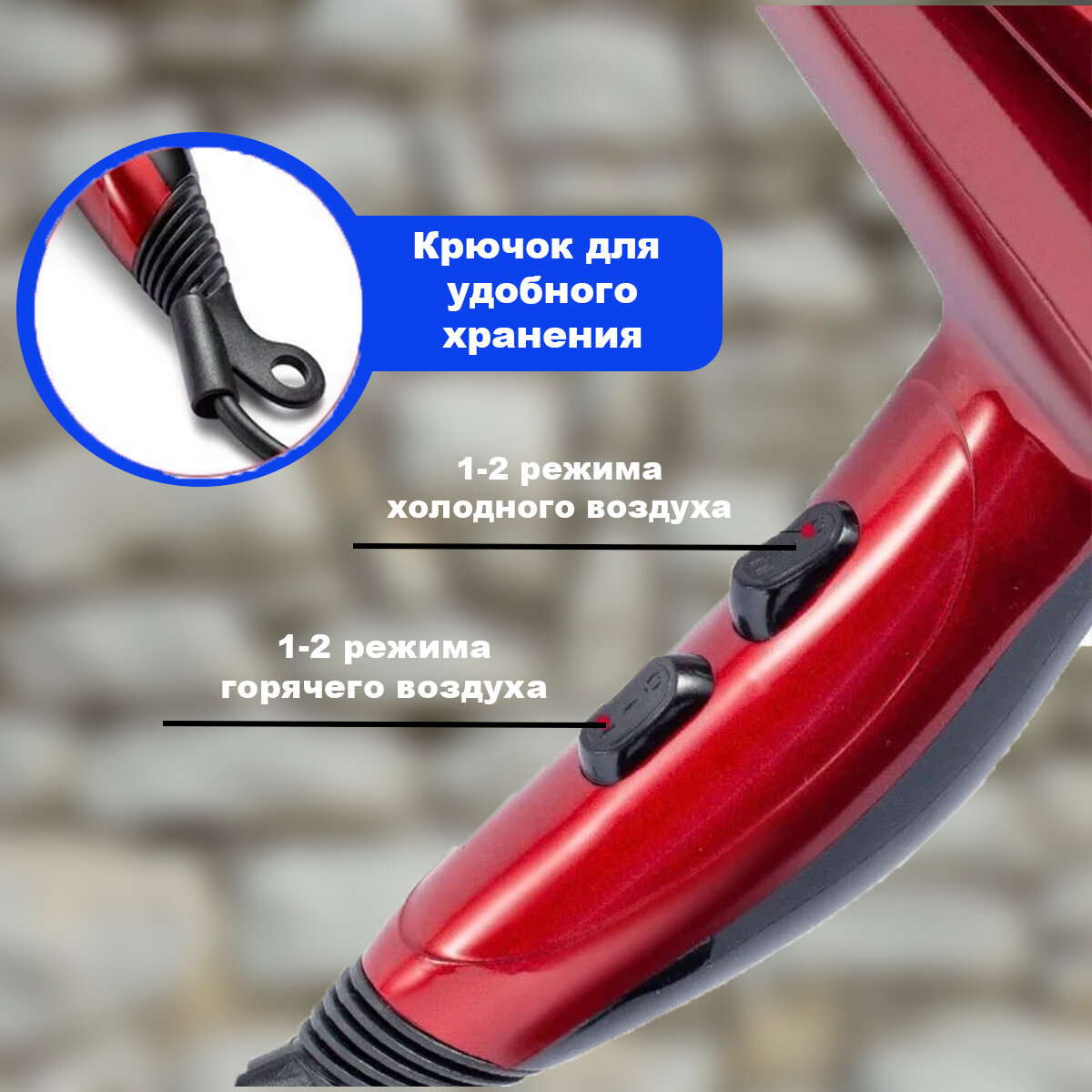 | Дополнительная информация | . Фен для волос обладает продуманной эргономикой и прочной конструкцией, благодаря чему он не занимает много места. Профессиональный фен с легкостью поместится в дорожную сумку и будет удобен для путешествий и поездок |