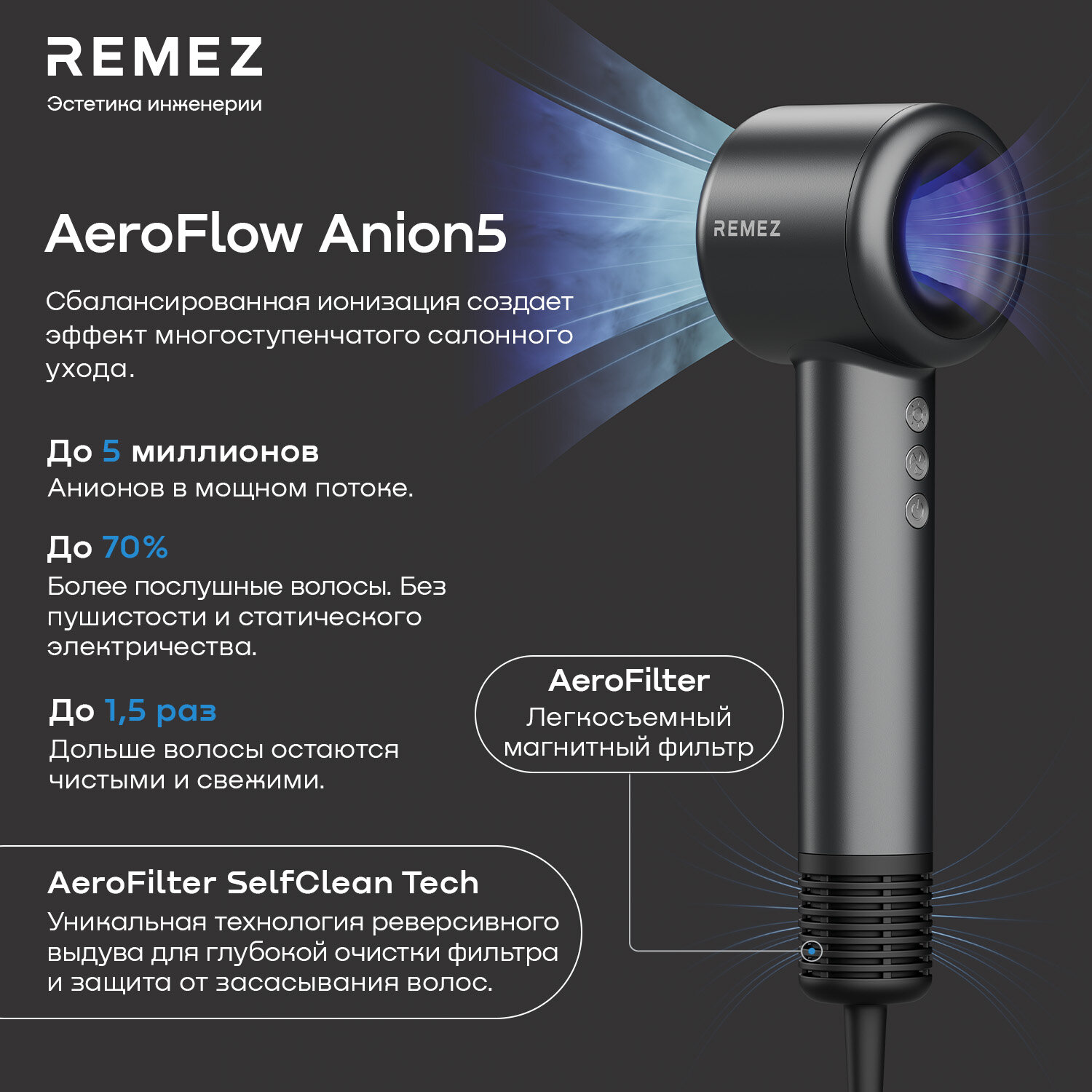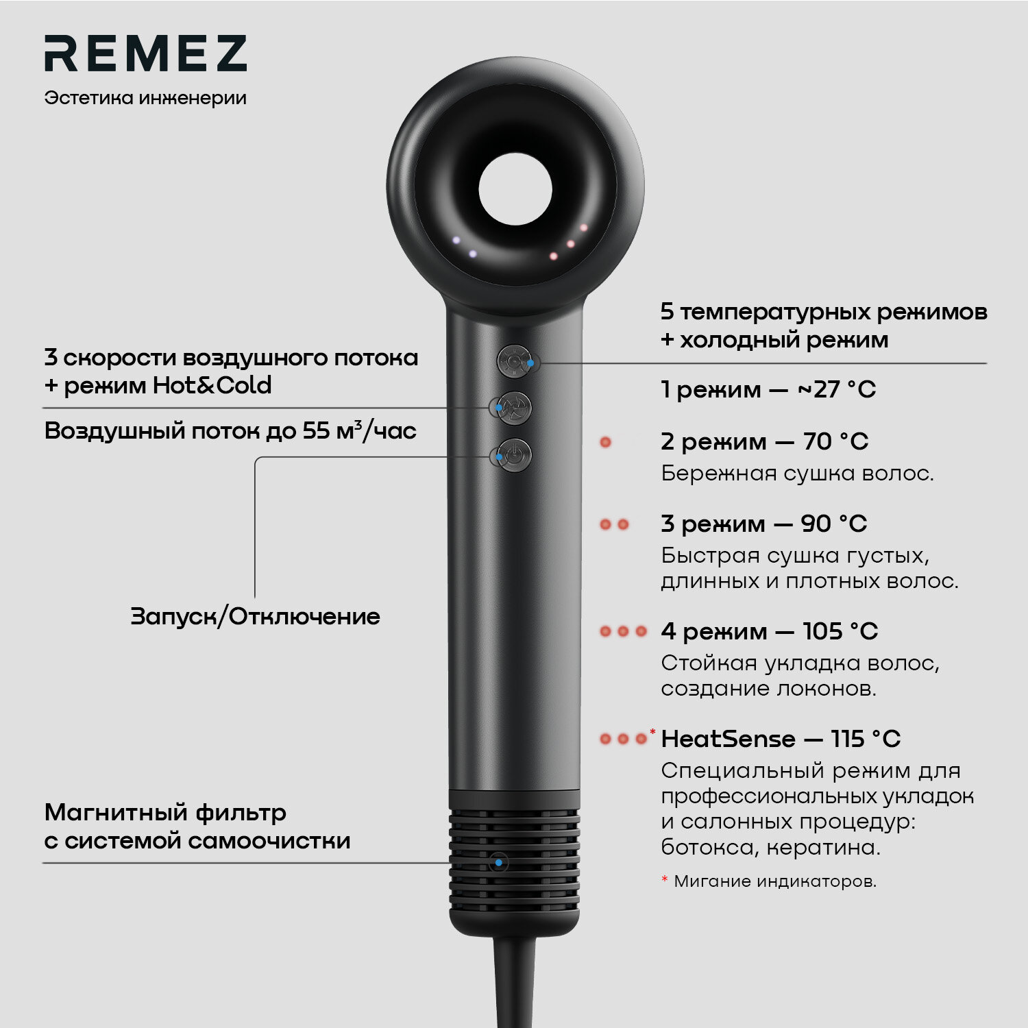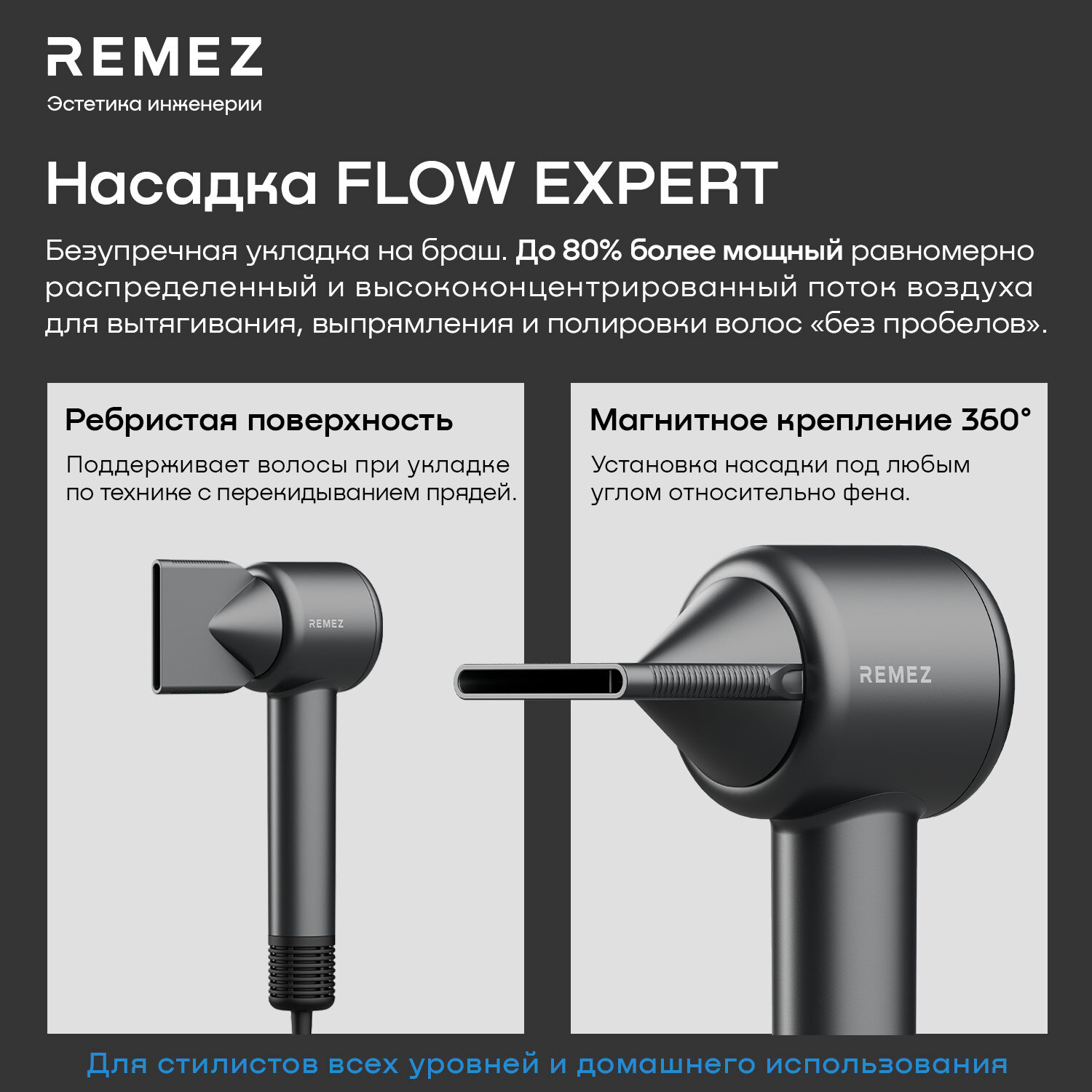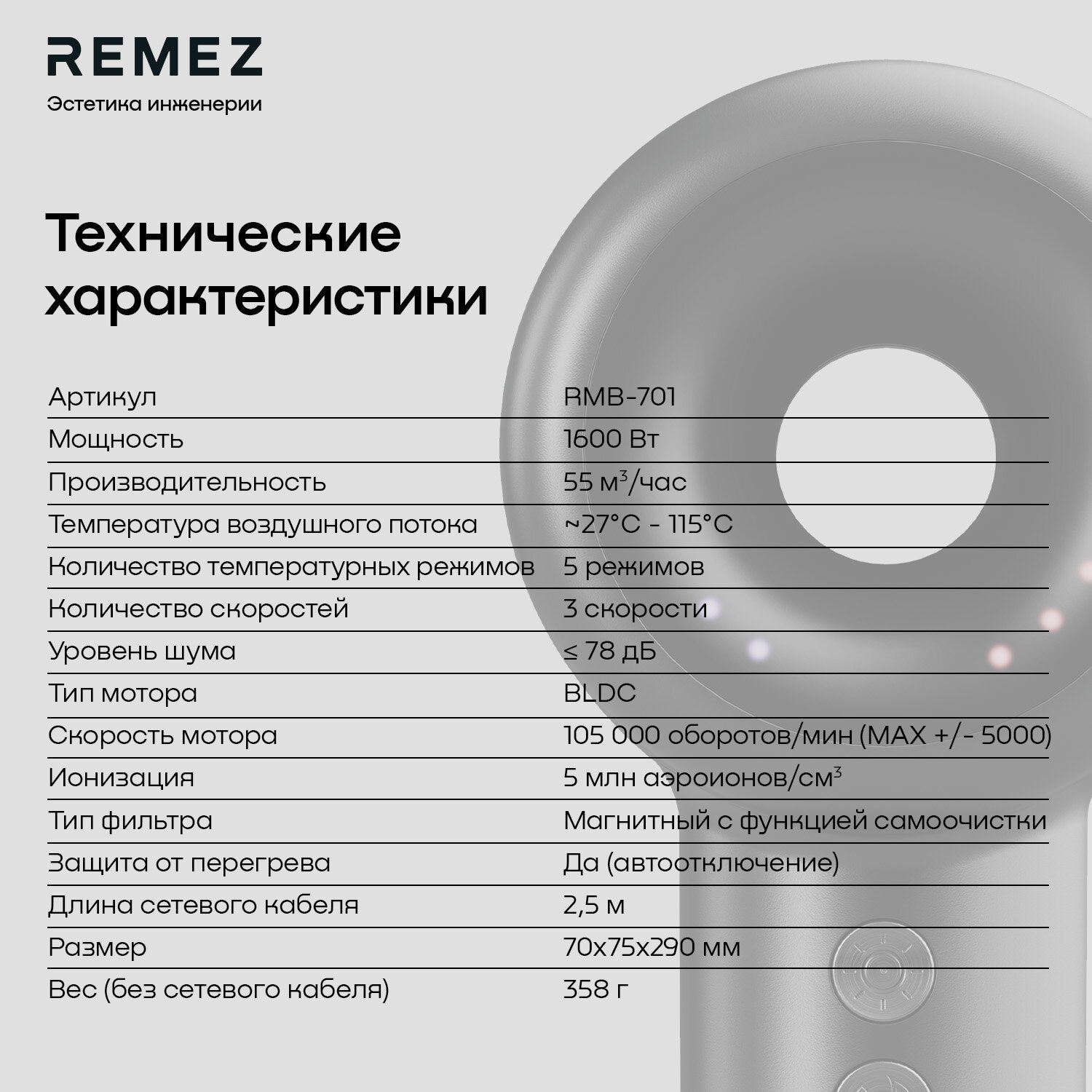 Профессиональный фен-стайлер с насадками REMEZ Model E RMB-701 интересное:
