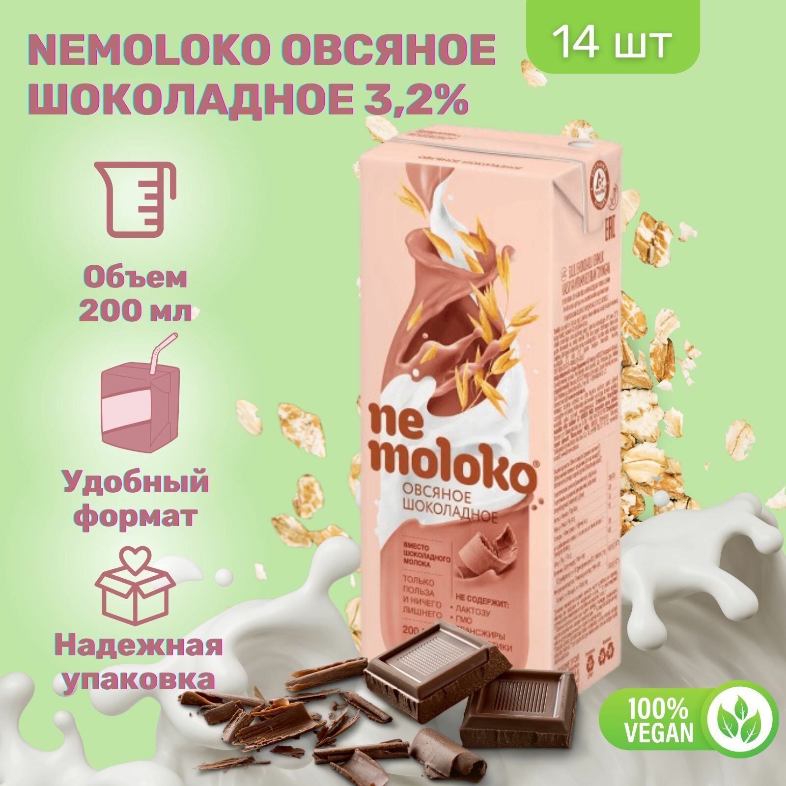 Овсяный напиток Nemoloko "Шоколад", 3,2% жирности, 200мл, 14шт