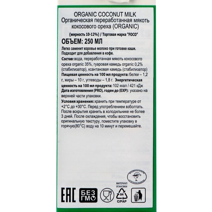 FOCO кокосовое молоко органическое 10-12% в пакете, 250 мл интересное: