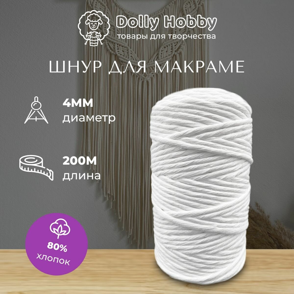 Купить Шнур для рукоделия и макраме Dolly 80% хлопок 200 метров, 4мм, белоснежный цвет