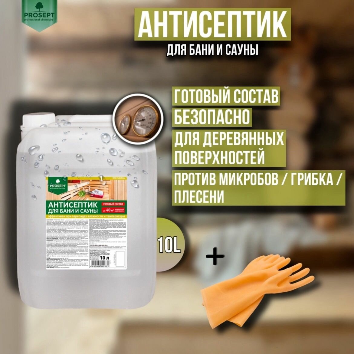 Купить Антисептик для бани и сауны PROSEPT ECO SAUNA готовый состав 10 литров + перчатки