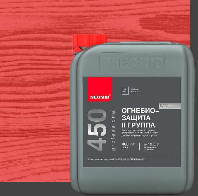 СохранитьОгнебиозащита Neomid 450 2 группа огнезащитной эффективности, для внутренних и наружных работ, бесцветный 10кг интересное: