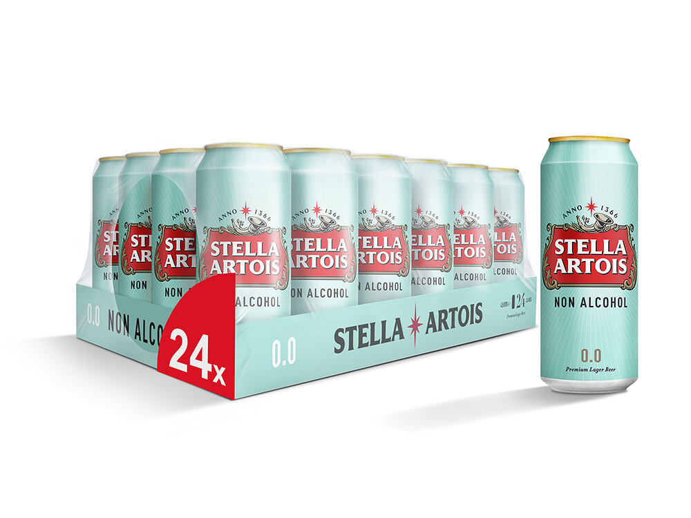 Купить Stella Artois Non Alcohol Пиво Стелла Артуа безалкогольное, светлое пастеризованное, банка 0,45 л, 24 шт. в упаковке