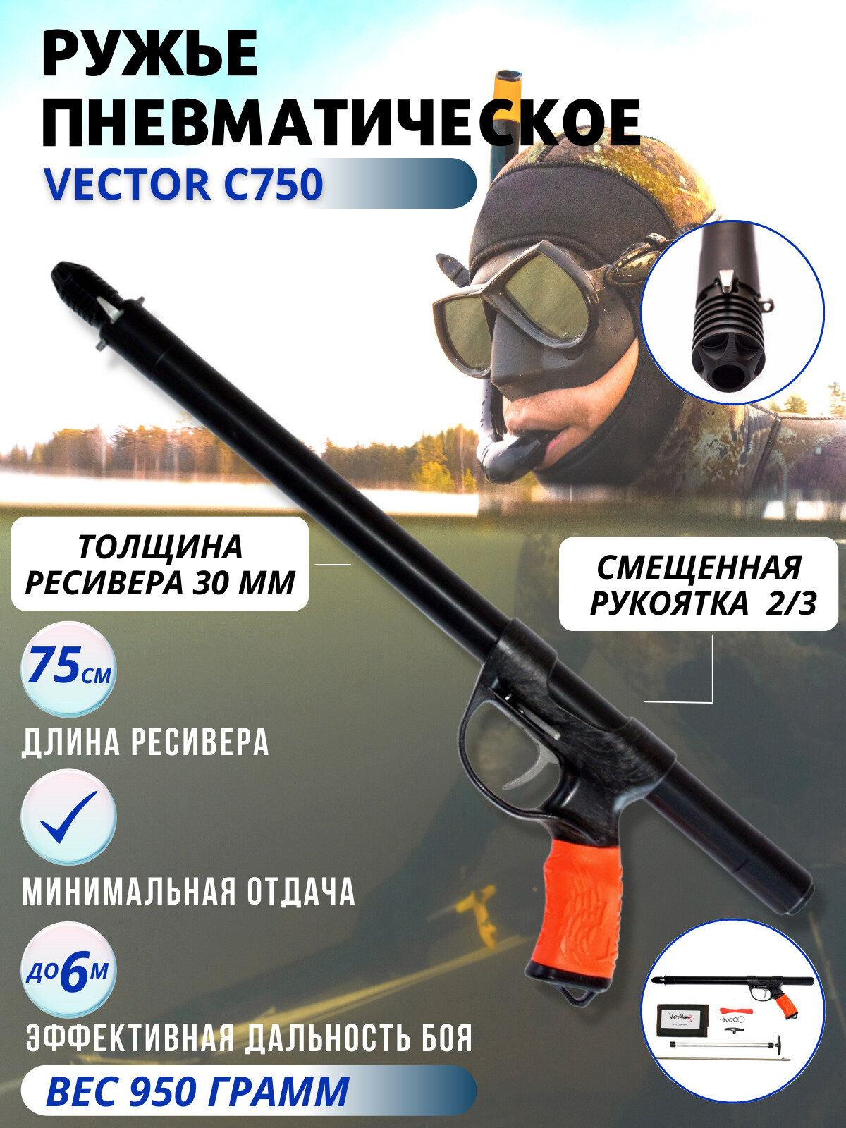 Ружье пневматическое для подводной охоты VECTOR C 750, торцевая рукоятка