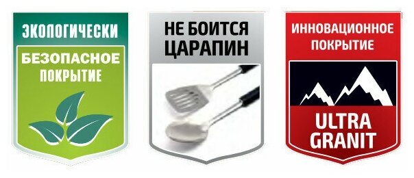| Плюсы: | Новое антипригарное покрытие Гранит Ультра, допускающее использование металлических кухонных приборов при перемешиваниях. |