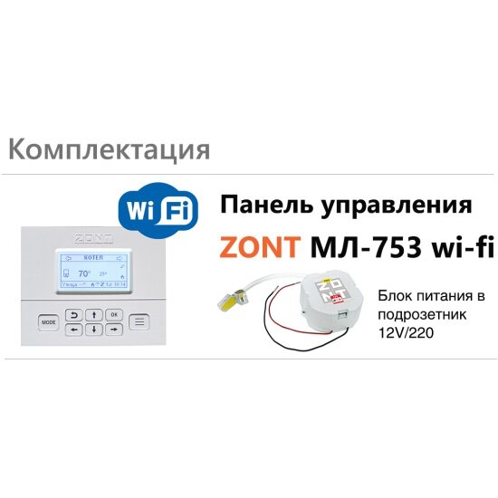 | Подробная комплектация | Панель Zont МЛ-753 wi-fi 1 шт. Блок питания в подрозетник 1 шт. Паспорт изделия 1 шт. |