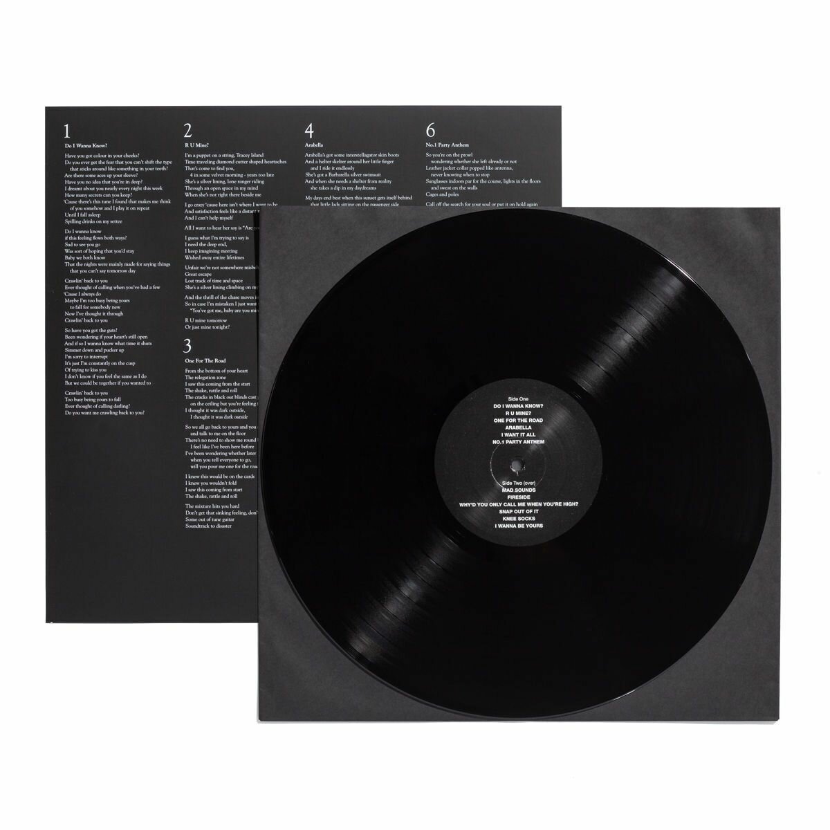 | Треклист | A 1. Do I Wanna Know? 04:32 2. R U Mine? 03:21 3. One For The Road 03:26 4. Arabella 03:27 5. I Want It All 03:05 6. No.1 Party Anthem 04:03 B 1. Mad Sounds 03:25 2. Fireside 03:01 3. Why'd You Only Call Me When You're High? 02:41 4. Snap Out Of It 03:13 5. Knee Socks 04:17 6. I Wanna Be Yours 03:04 |