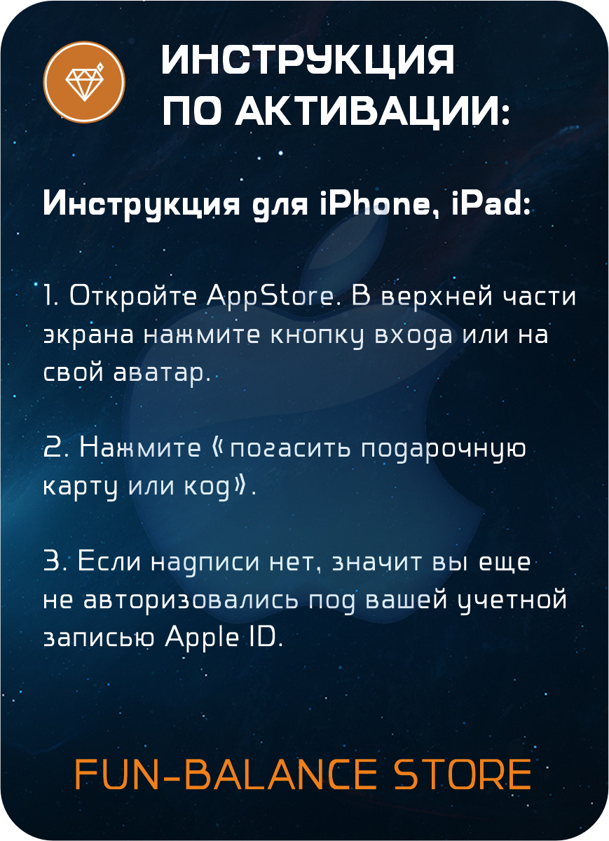 | Инструкция по активации | 1) Перейдите на страницу apple.com/redeem. 2) Авторизуйтесь под своим аккаунтом или зарегистрируйтесь. 3) Введите цифровой код и нажмите кнопку «Активировать». |
