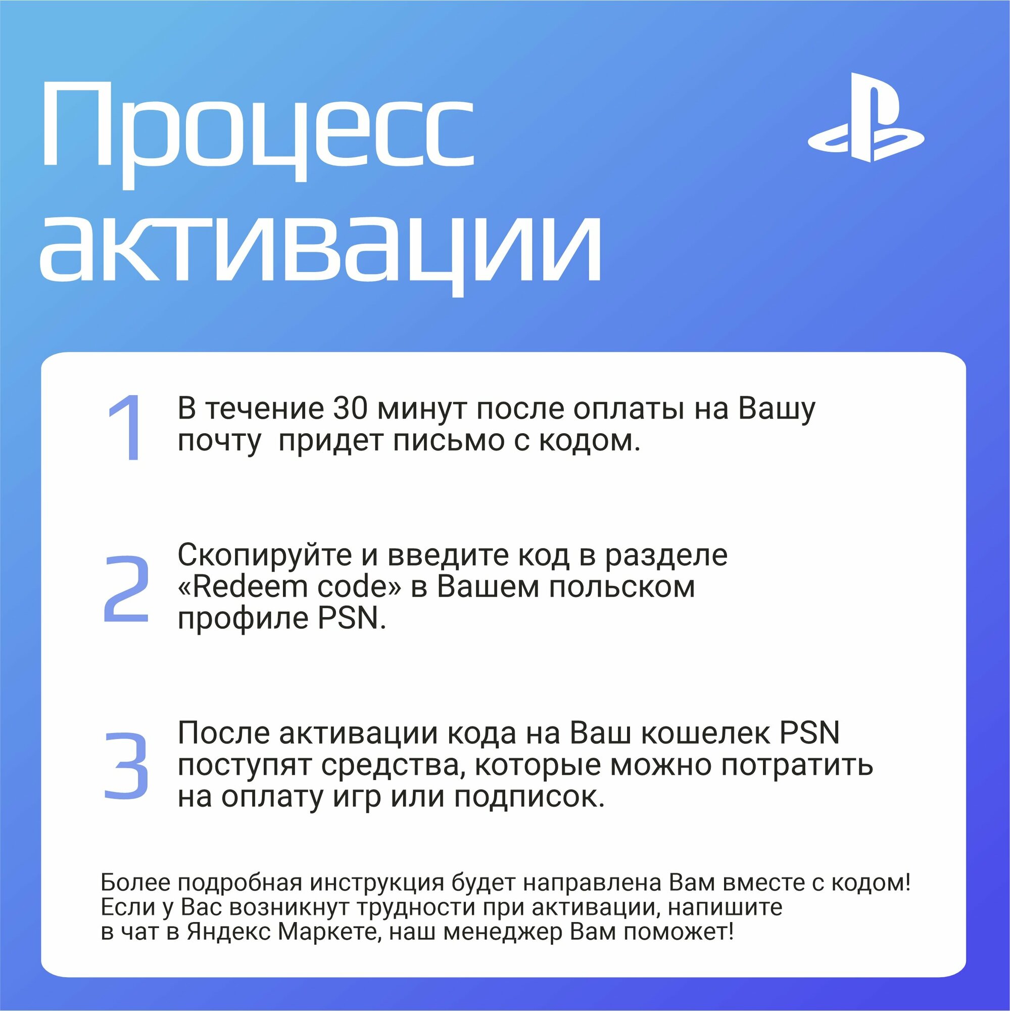 | Инструкция по активации | 1. Войдите в — store playstation и нажмите на свой аватар в верхней части экрана. 2. Выберите Погашение кодов в раскрывающемся меню. 3. Введите код и нажмите Погасить. 4. Средства будут добавлены в вашу учетную запись. |