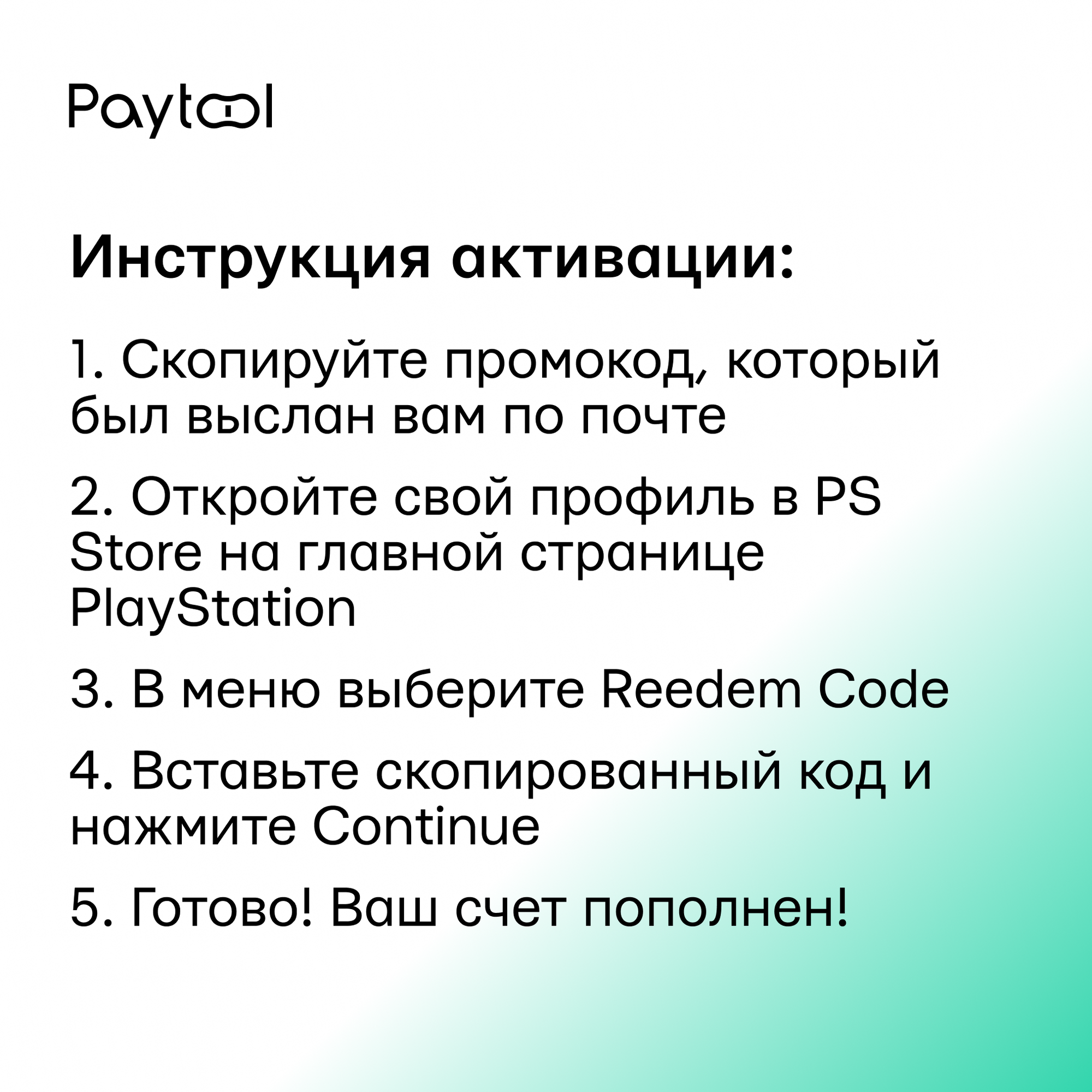 | Инструкция по активации | Как активировать подарочную карту для PS Store USA? Просто следуйте этим шагам: 1. Откройте PlayStation Store и перейдите к своему профилю, щелкнув на своем аватаре в верхней части экрана. 2. В меню, которое появится, выберите "Погашение кодов". 3. Введите код с вашей подарочной карты и нажмите "Погасить". 4. После этого средства или материалы сразу же будут зачислены на вашу учетную запись. |