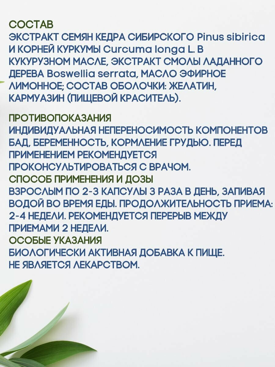 | Состав | Экстракт семян кедра сибирского и корней куркумы в кукурузном масле, экстракт смолы ладанного дерева Boswellia serrata, масло эфирное лимонное, оболочка капсулы (желатин, Е122). |