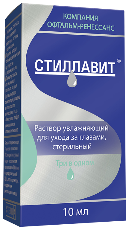 | Фармакологическое действие | Особым свойством молекул гиалуроната натрия, D-пантенола и натрия хондроитина сульфата является выраженная способность связывать большое количество молекул воды. Имея необходимую вязкость и высокие адгезивные свойства по отношению к переднему отрезку глаза, раствор Стиллавит, содержащий указанные вещества, образует равномерную и стабильную, в течение длительного времени, слезную пленку, которая не смывается при моргании и не вызывает снижение остроты зрения. Раствор Стиллавит: увлажняет, смазывает и восстанавливает поверхность роговицы и конъюнктивы; приносит быстрое облегчение при сухости и раздражении глаз; устраняет дискомфорт при ношении контактных линз; снимает усталость при интенсивной зрительной нагрузке (при длительной работе с компьютером и времяпровождении перед телевизором, при управлении транспортом в ночное время и т.д.). |