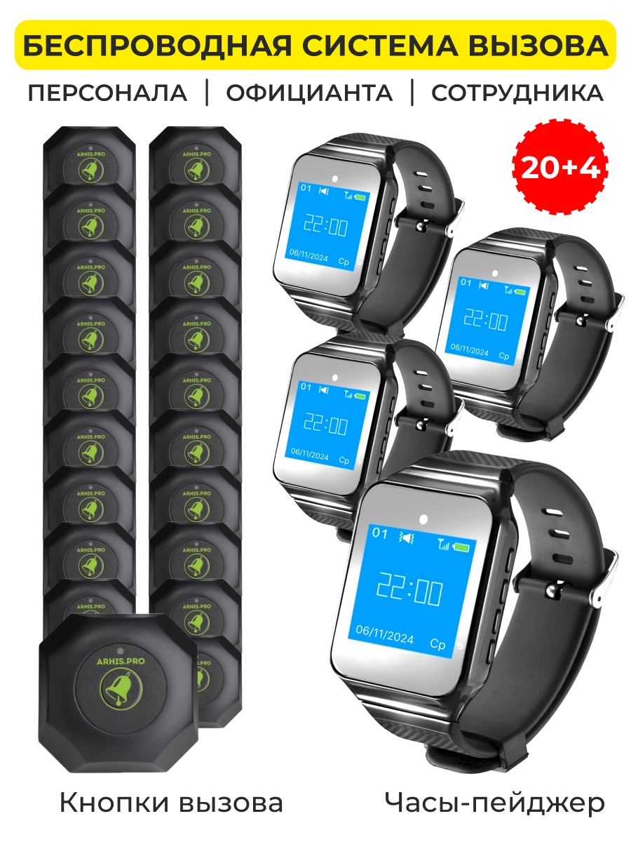 Кнопка вызова администратора, часы официанта, беспроводной комплект вызова персонала.