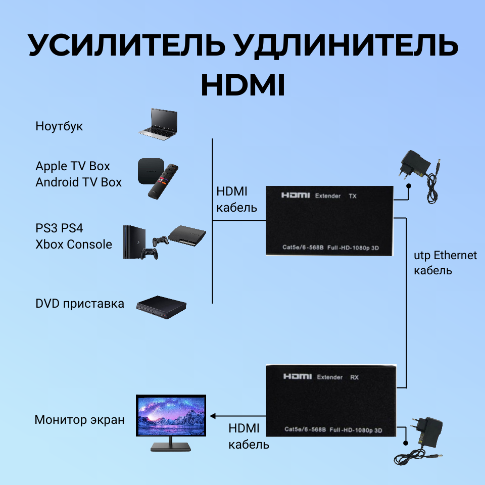 Удлинитель HDMI 60 метров Full HD-1080P по Ethernet UTP витой паре интересное: