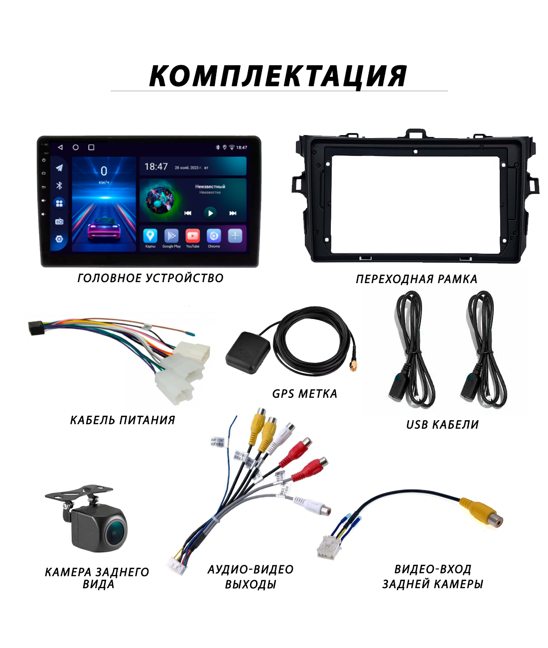 | Подробная комплектация | Головное устройство, переходная рамка 9 дюйм, кабель питания под авто, кабель usb - 2шт, gps-метка, антенна 4G, коса rca (аудио-видео выходы, слот под сим-карту), видео-вход камеры заднего вида, камера заднего вида (в подарок). |