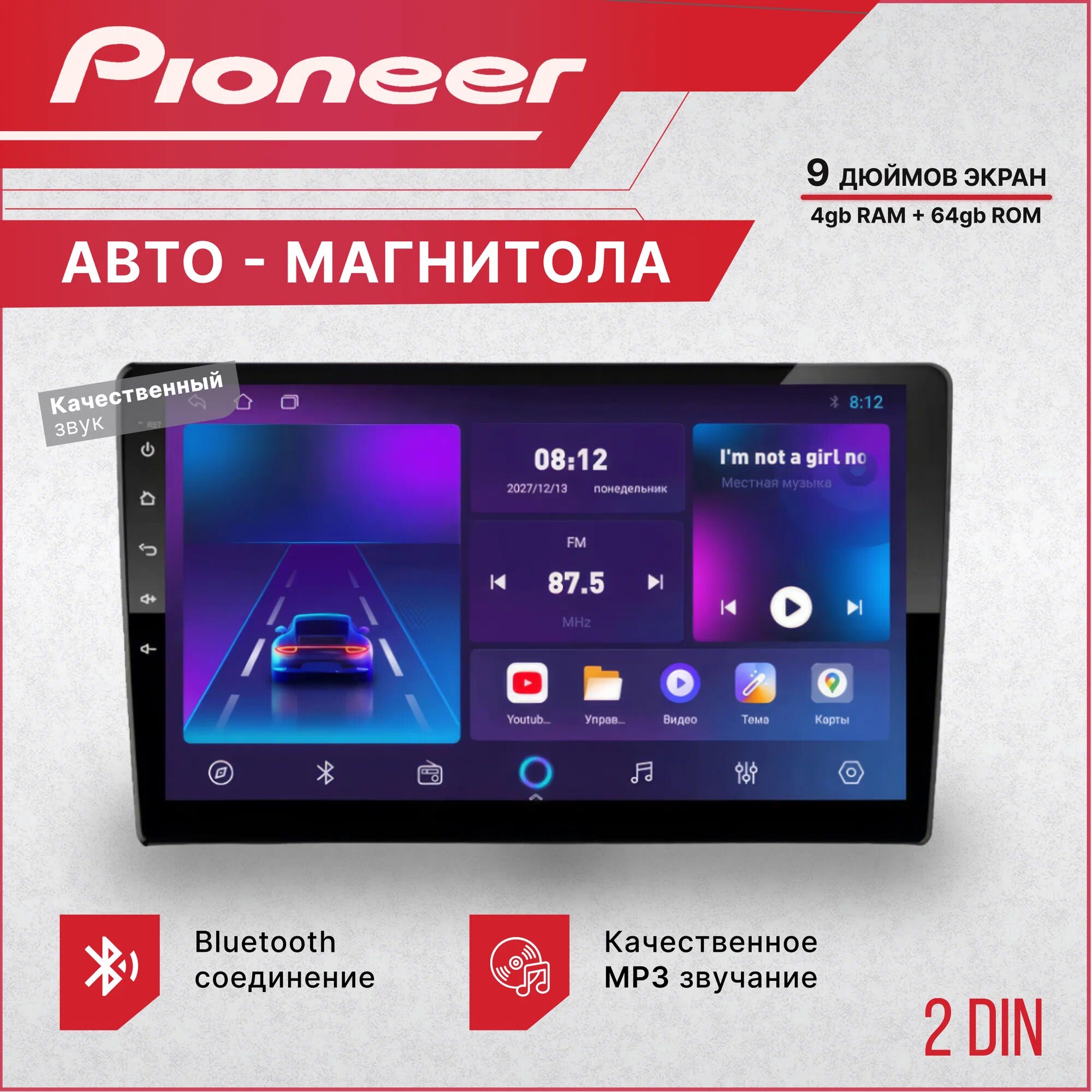 Магнитола автомобильная, автомагнитола 2 дин Pioneer AX3 ( 6+64Gb, 9 дюймов), автомагнитола USB, AUX на передней панели, автомагнитола с блютуз, подсветка