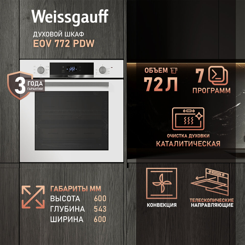 Духовой шкаф Weissgauff EOV 772 PDW конвекция, 3 года гарантии, 60 см ширина, утапливаемые рукоятки, 72 литра, 7 режимов, кольцевой нагревательный элемент, телескопические направляющие, каталитическая очистка, двойное стекло дверцы
