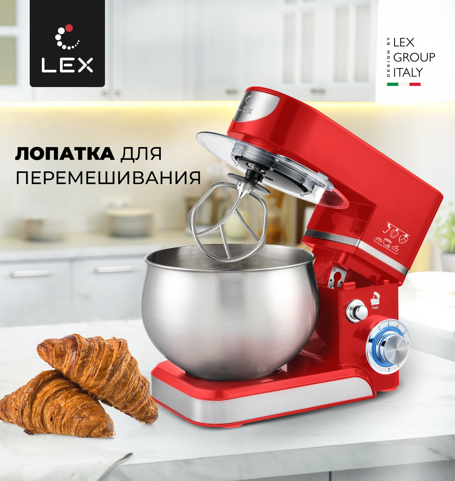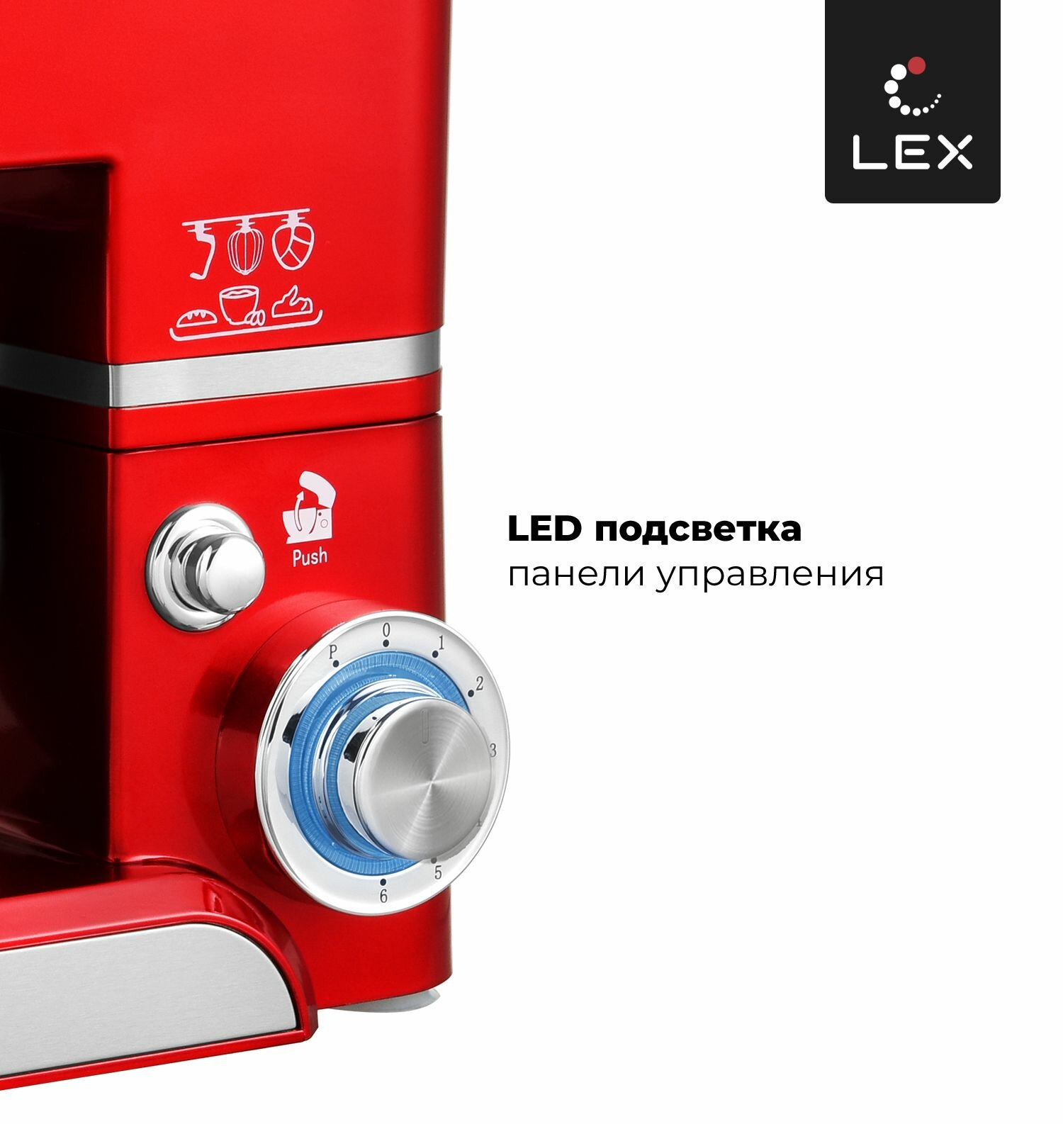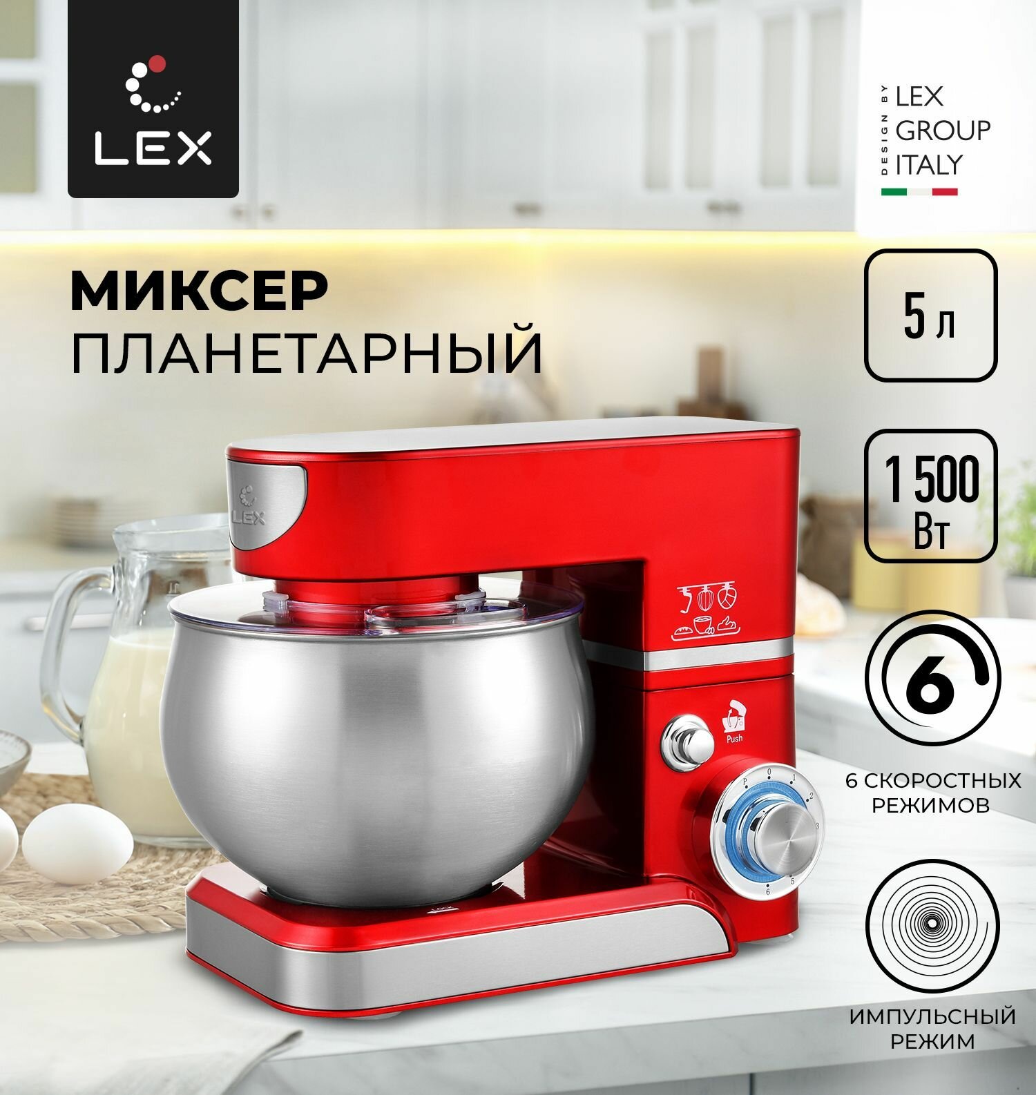 Планетарный миксер LEX LXMX 4130, 1500 Вт, 6 скоростей, чаша 5 л, 3 насадки, красный интересное: