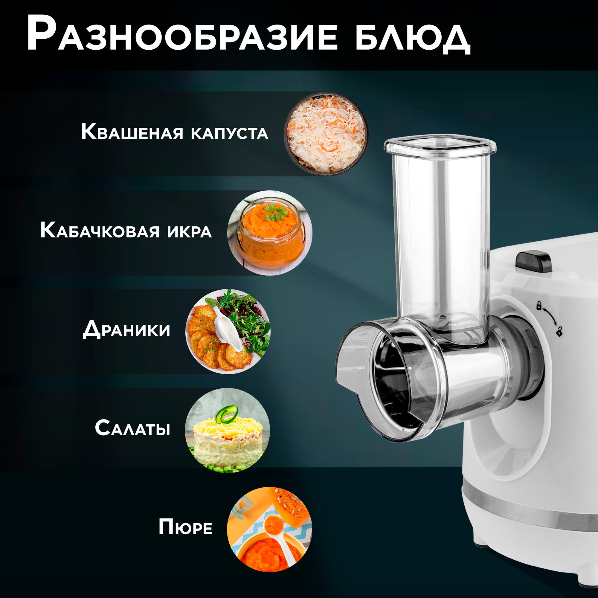 | Дополнительная информация | 3 овощерезки (шинковка, крупная, мелкая), насадка для драников |