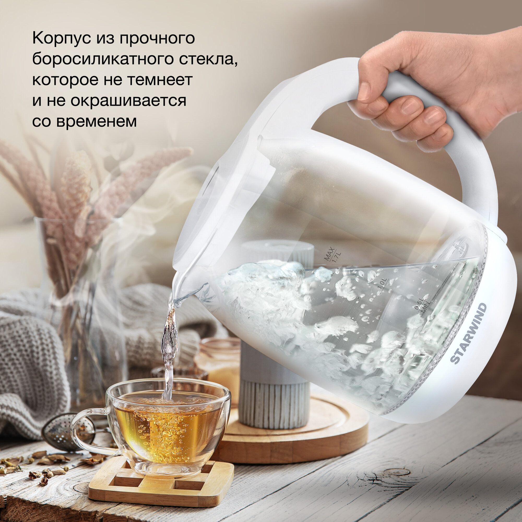 Чайник электрический Starwind SKG4215, 2200 Вт, 1.7л, белый, стекло интересное: