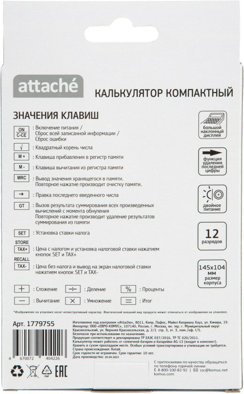 | Подробная комплектация | Калькулятор настольный КОМП Attache,AС-224WGR,12р,дв.пит,бел-сер,145x104x28 |