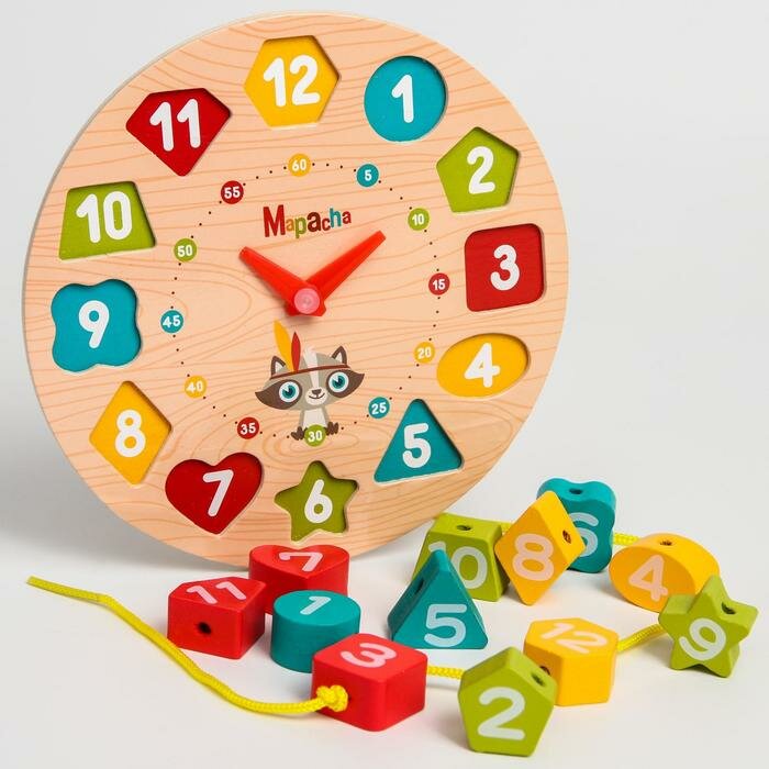 Купить MAPACHA Развивающая игра. Часы (шнуровка, обучение формам и цифрам, дерево, в коробке, от 3 лет) 768